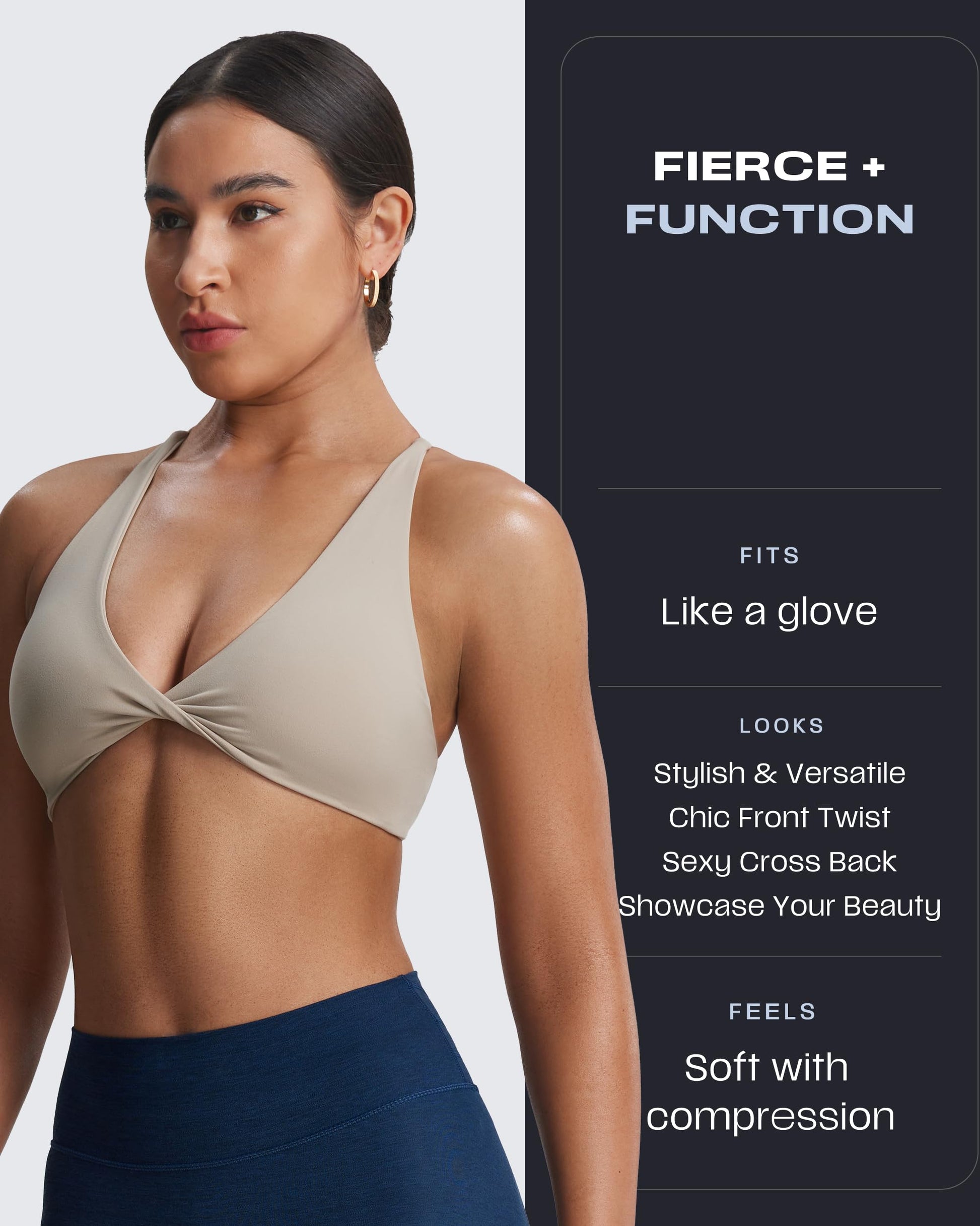 • The Sienna twist womens sports bra featuring thin crossed back straps and padding, despite small straps, it doesn’t bite into your traps and cause neck pain