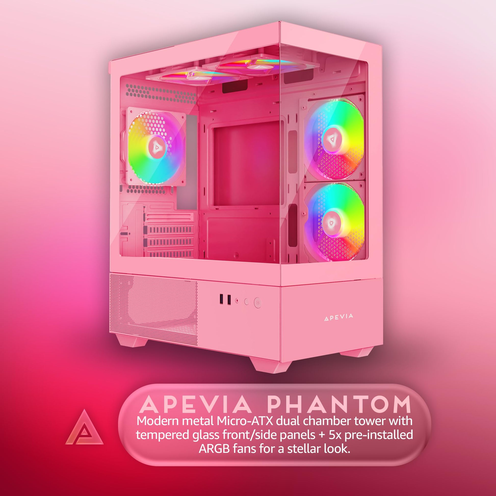 Apevia Phantom-PK Phantom Micro-ATX Dual-Chamber Gaming PC Case w/ 5X 120mm ARGB Fans, 366 RGB Modes, Dual Tempered Glass Panels, 240mm Radiator Support, 2X USB3.0, HD Audio Port, Pink