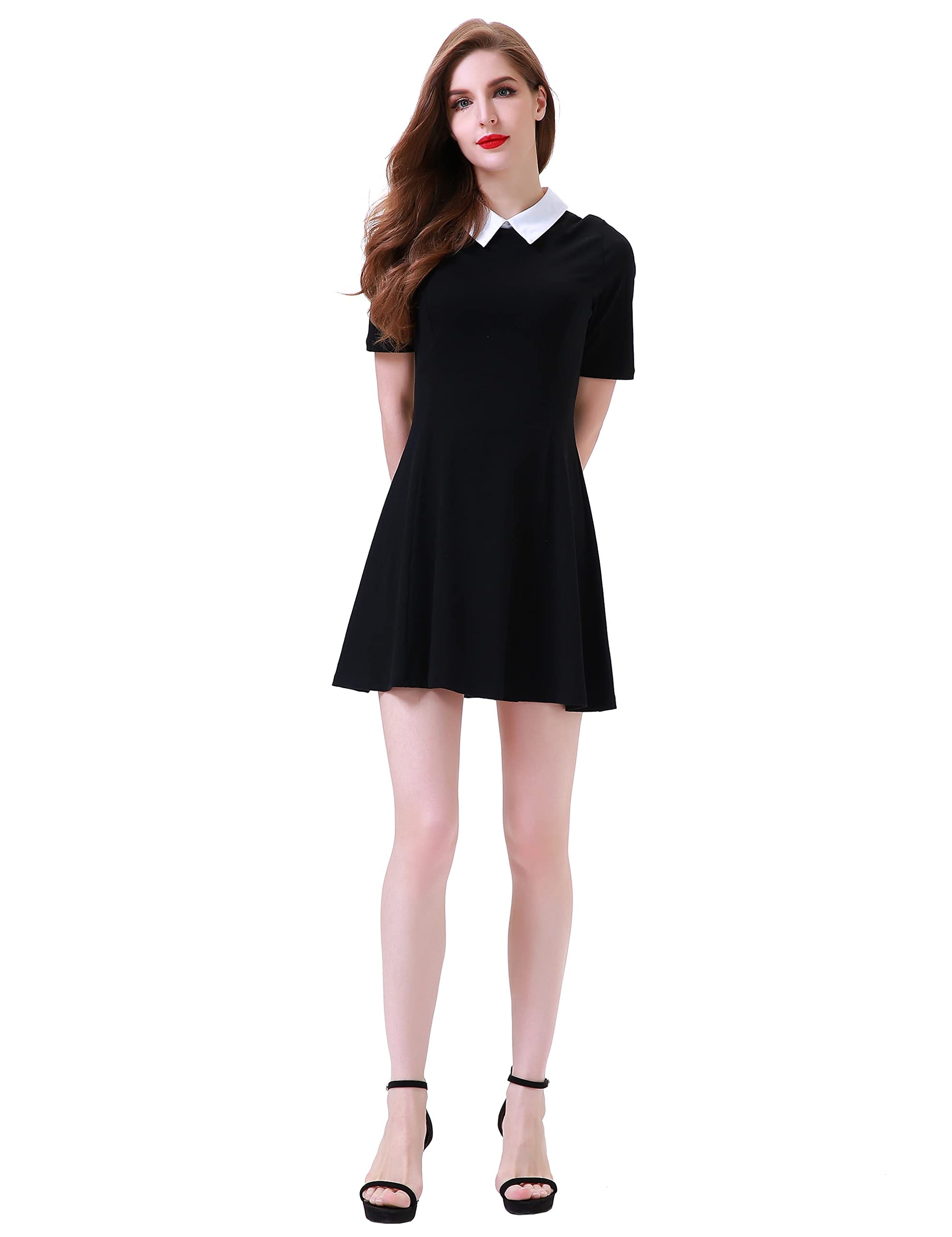• Design: Solid color, high waist, above the knee length, white Peter Pan collar and hidden back zipper closure add darling retro details to this spookily stylish dress, perfect collared dress for Halloween costumes for women or regular daily outfit.