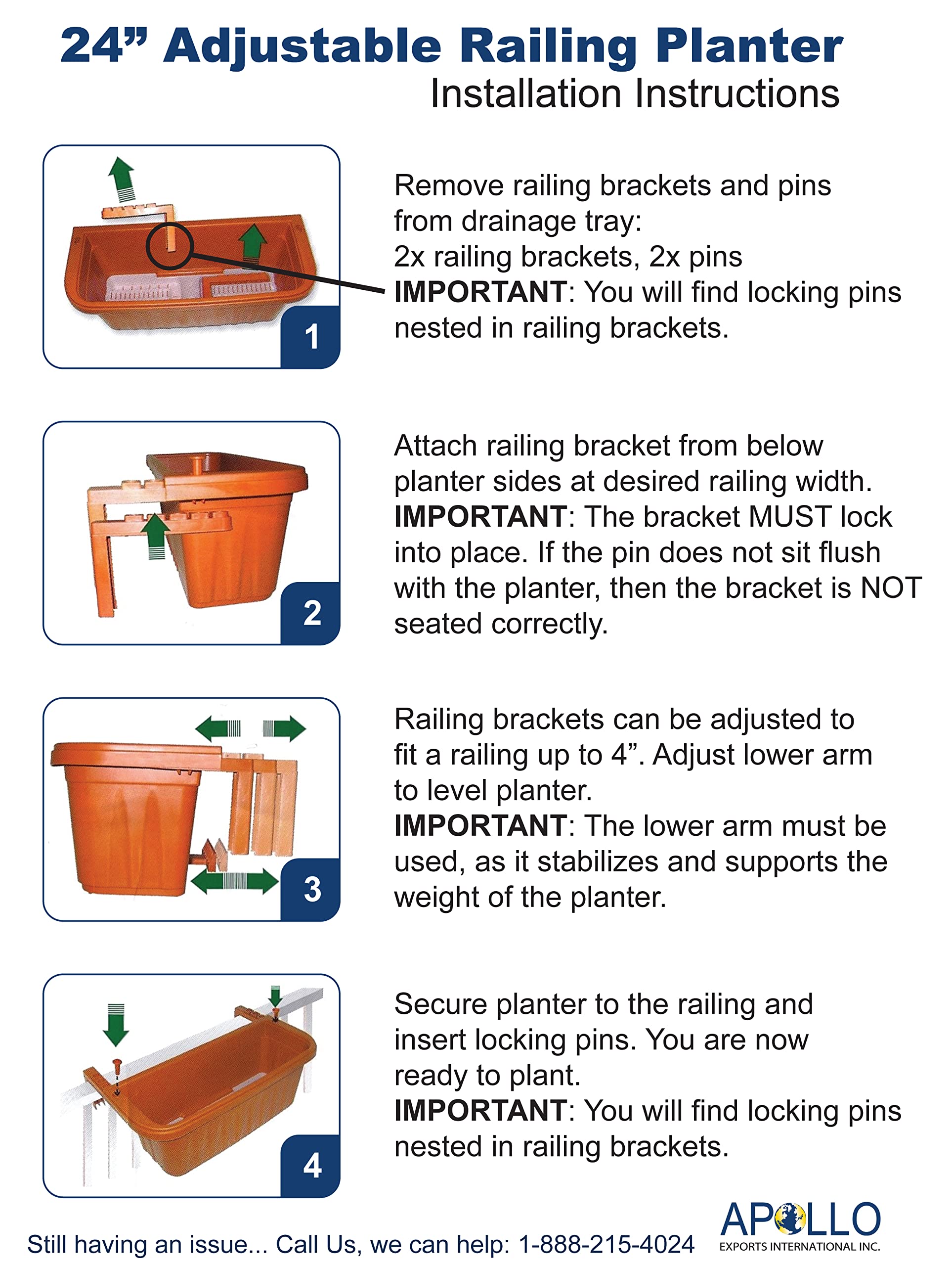 Details: Beautify your decks, fences, railings, & Sign posts with these ingenious adjustable railing planters. Lock the support arm to the desired width, hang & you are done! No tools, Mounting hardware, or drilling required. Ideal for wood or metal railings. Hidden lower bracket keeps the planter level. Excess water sits in the lower reservoir. Measures 24'L x 7.5'W x 7.5'H. IMPORTANT: You will find locking pins nested in railing brackets.