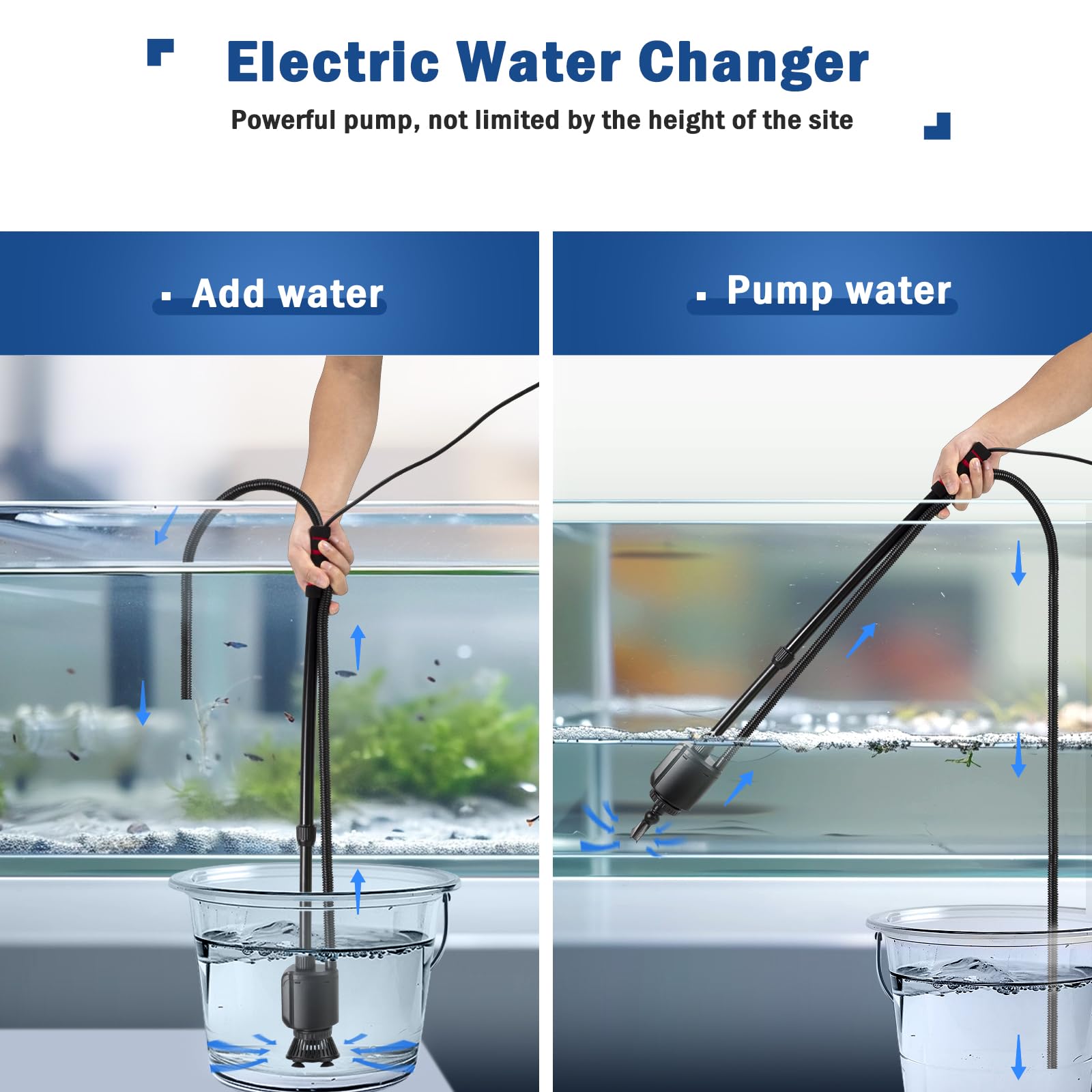 • Upgrade Electric Water Changer: Powerful power, rapid change water; Effectively clean up impurities in the fish tank; The starting water level can be as low as 2 in and the pumping as low as 0.3 in; Equipped ceramic shaft,Very quiet operation