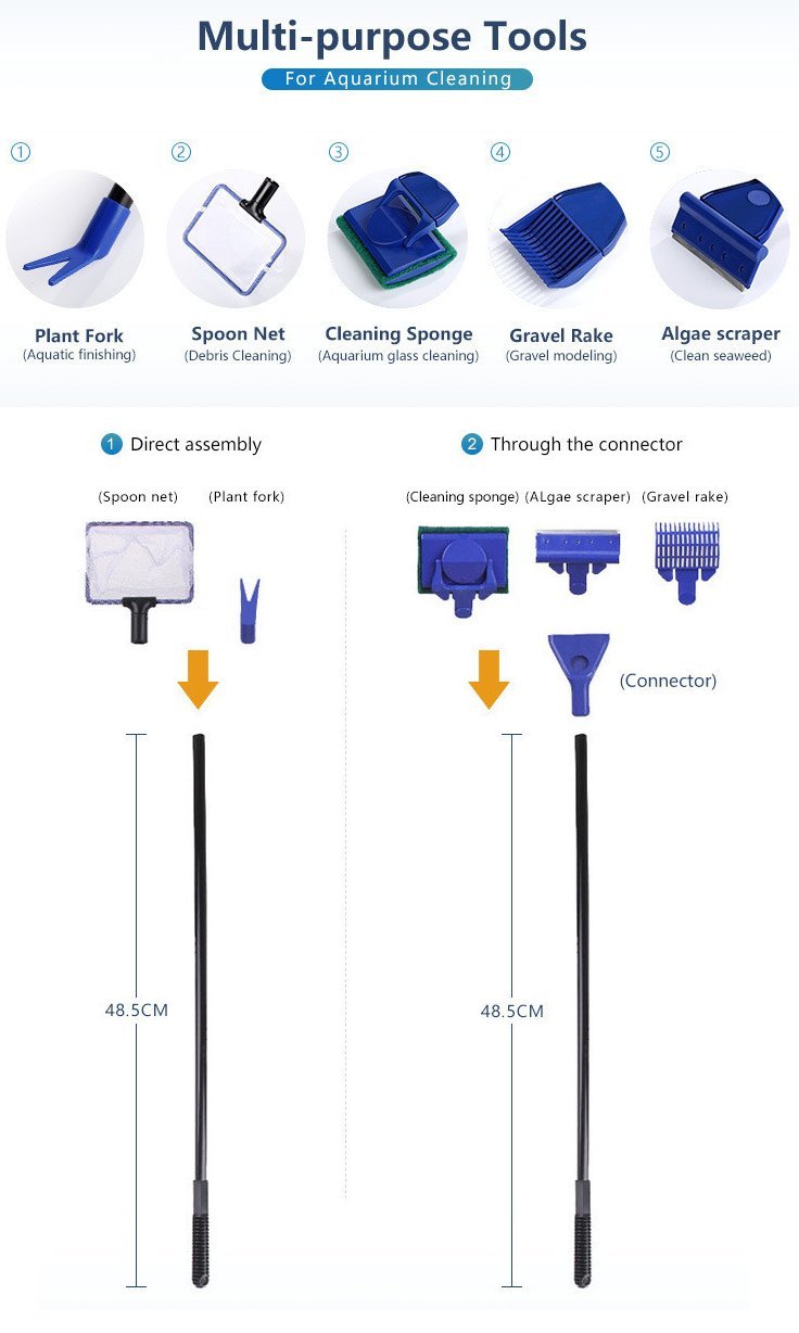 FEATURES: 1 Comfortable extendable handle and 5 easily interchangeable tools for all your different needs. Make your aquarium maintenance easy. Easy to assembled and disassemble. High quality reef safe, aquarium safe, ABS plastic. Anti-rust.