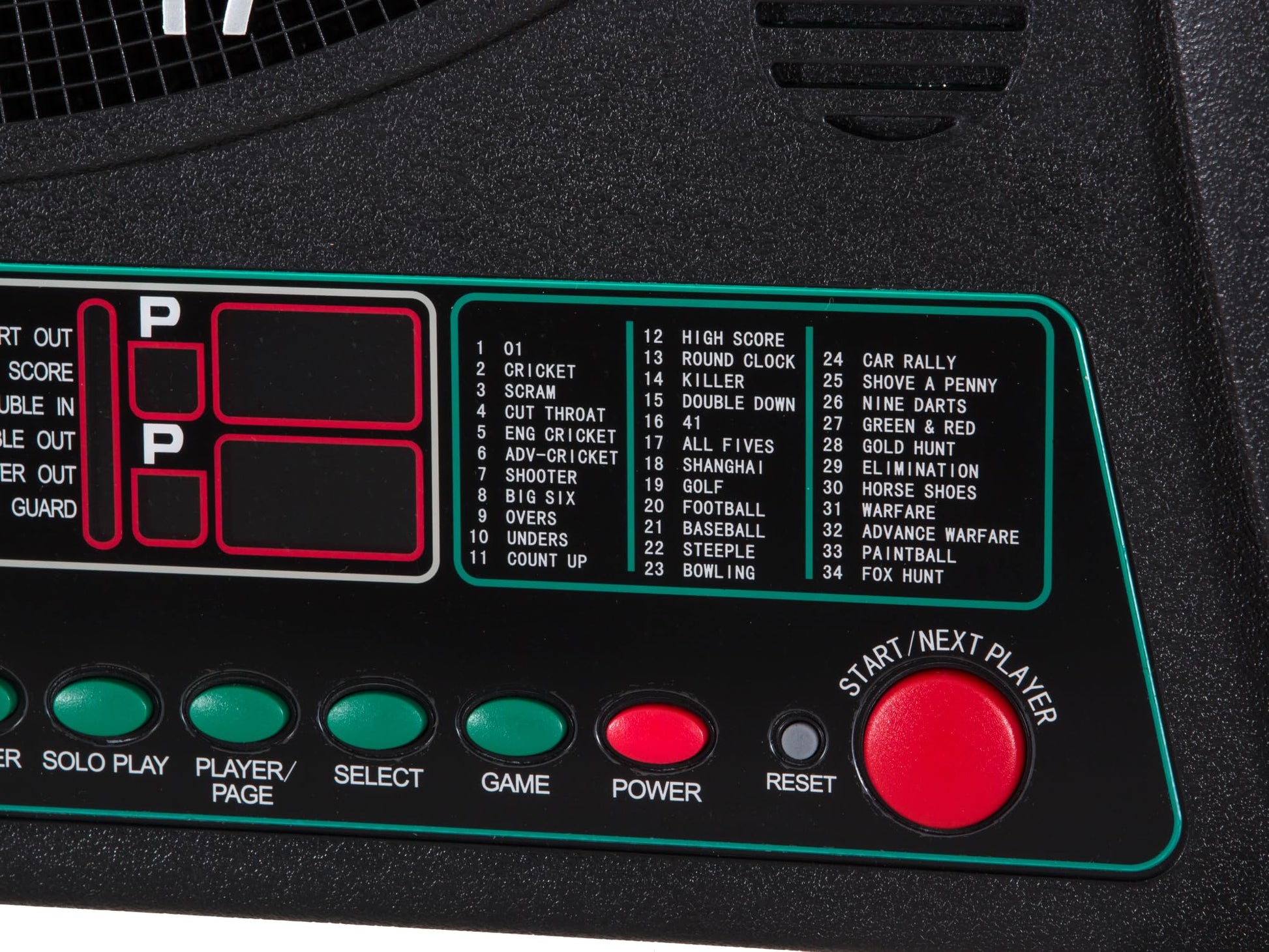 Details: The Arachnid Cricket Maxx 1.0 Electronic Dartboard Cabinet Set features a 13.5' target area, 34 games, and 183 level variations (4 cricket games) for up to eight players. The large door mounted backlit X/O cricket display is in the popular pub style format. Solo play allows for practice and optional heckler feature that mocks bad darts and applauds good scores adds a level of fun. The Cricket Maxx Cabinet Set includes built-in dart holders and two sets of soft-tip darts. The integrated wood door cabinet doors make it a perfect fit for the game room. The ARACHNID trademark is a registered trademark owned by Arachnid 360 LLC and used by Escalade Sports pursuant to license.