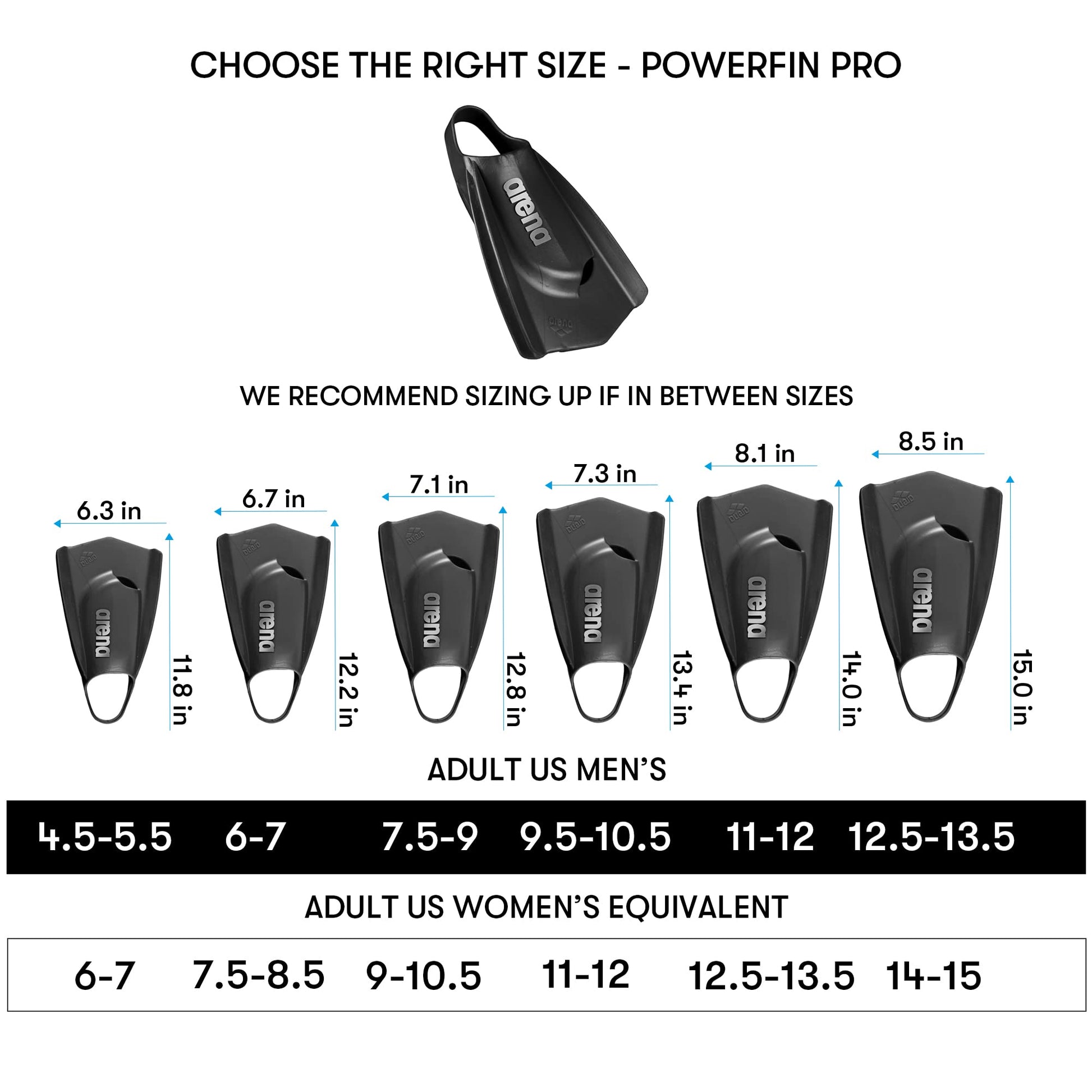 Details: arena's Powerfin Pro II Training Fins are the fins all expert swimmers have been waiting for. Their innovative design features a sloping surface and hydrodynamic slits in the top to allow you to swim with a faster leg kick and better control. With a short blade for maximum forward thrust, the open heel ensures maximum ankle flexibility, optimal stability and comfort. These high-quality swim fins are also equipped with special notches on the bottom ribs for faster kicks and side grooves for better control. Left and right fins are shaped individually. The soft silicone material provides maximum comfort and a reduced chance of blisters. PVC free. Training your legs vertically using Powerfin Pro II swim fins for just a few minutes today will help you improve your underwater phase. The vertical leg kick allows you both to control your body position and to make sure you are performing a proper leg kick. Refer to size chart for the best fit.