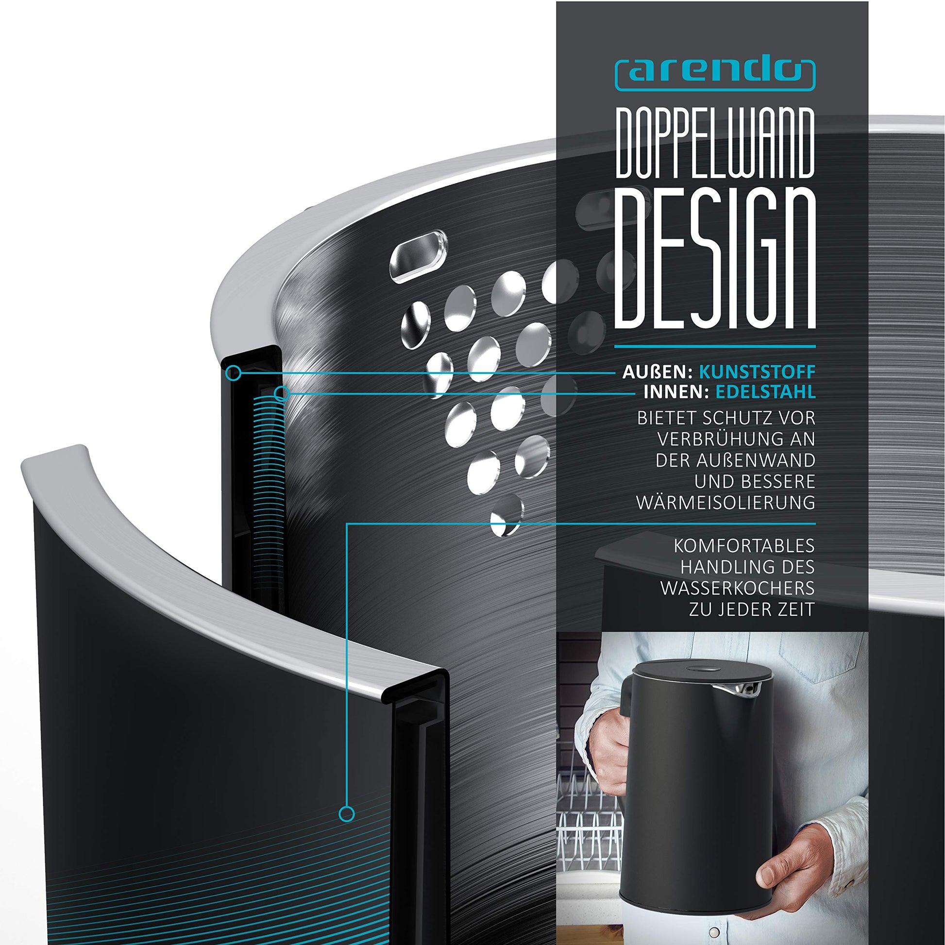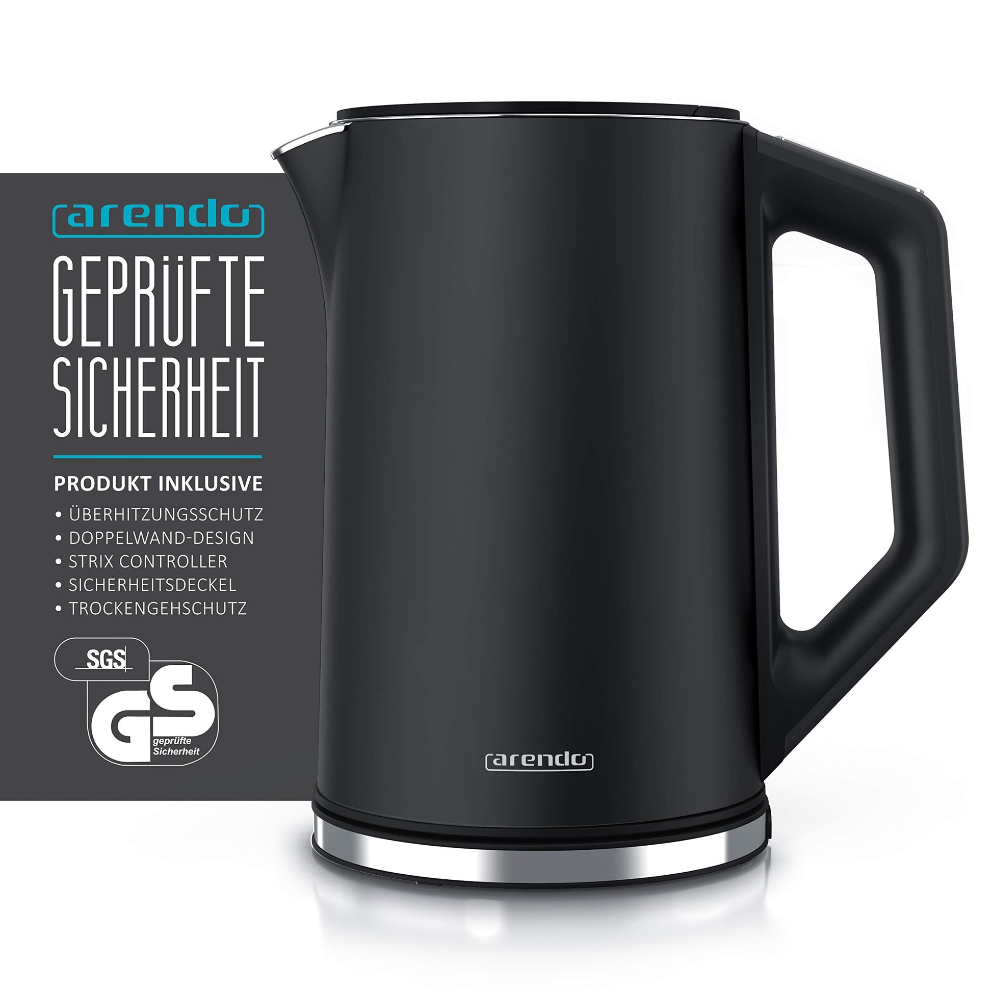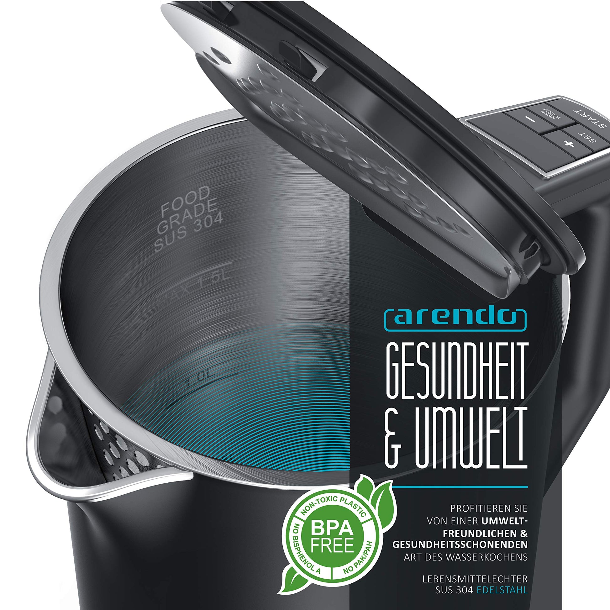 Arendo - Stainless Steel Kettle with Temperature Setting 40-100 Degrees in 5 Steps - Double Wall Design - Elegant Model - 1.5 Litre - 2200 W - Tea Maker with Temperature Display - GS - Black