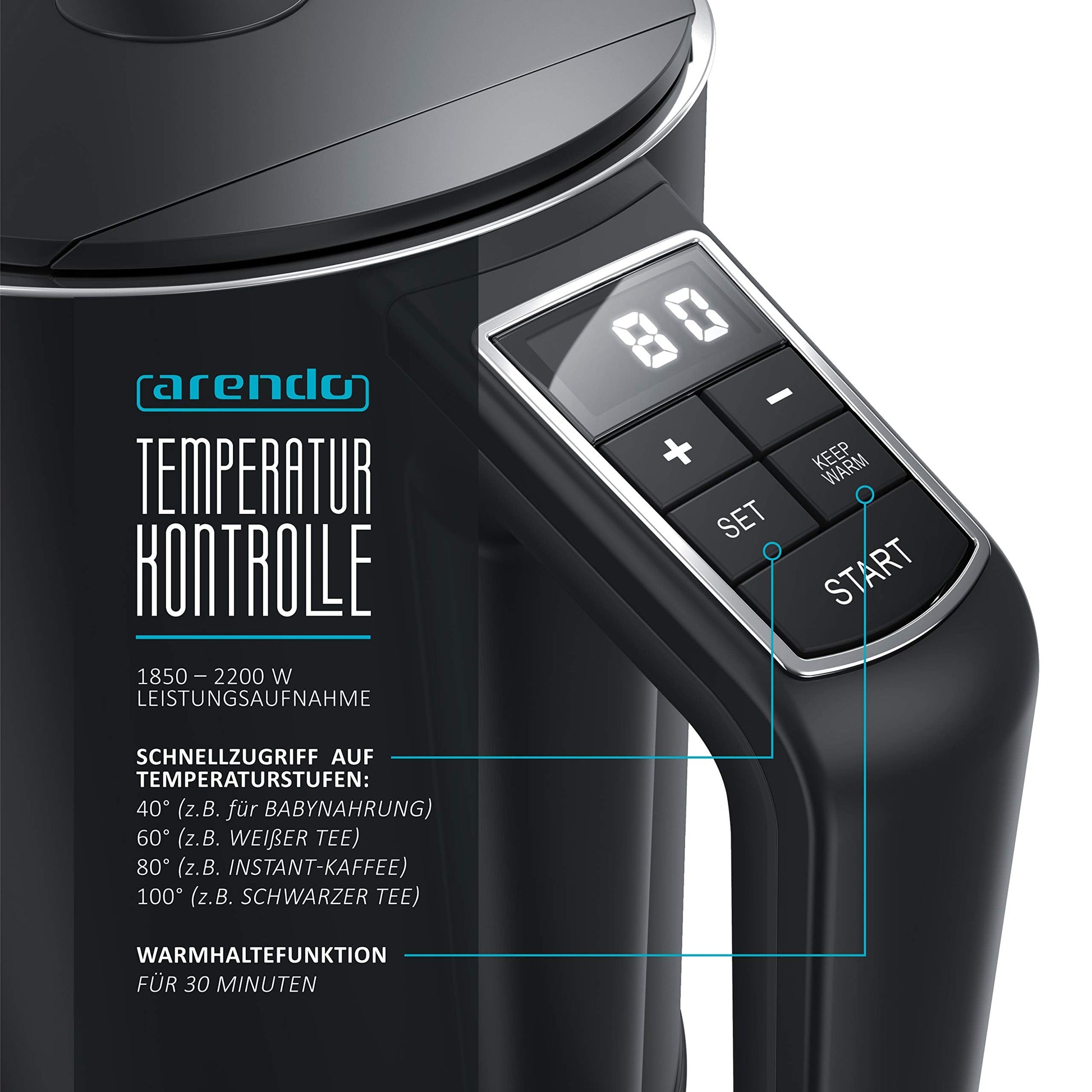 • - Thanks to 2200 watts, the device heats the water in a short time. The temperature is sensitively adjustable in 5° increments in the range of 40° to 100°. In addition, the SET button allows quick access to temperatures of 40°, 60°, 80° and 100°. The Elegant achieves exactly the value you enter using the temperature sensor