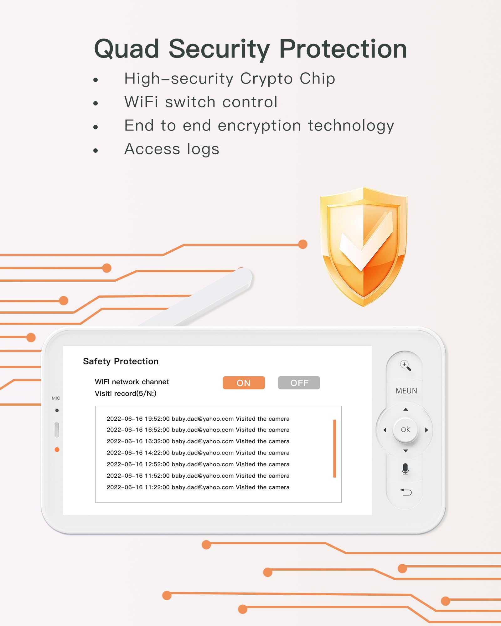 • UHD 2K/3MP 2 Camera:Our baby monitor with 2 cameras support 3MP UHD Came with clearer footage on App,4x zoom viewing,Clear night vision with 8 switchable IR LED, Warm night lamp for peace of mind in the night.