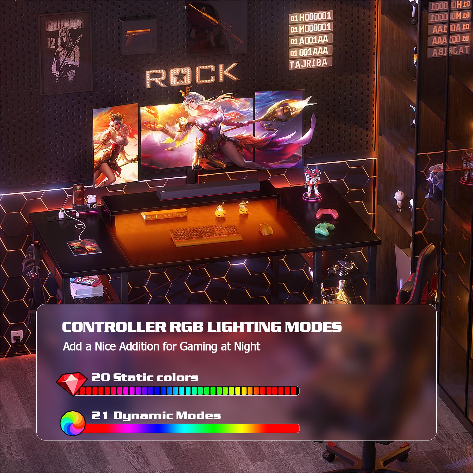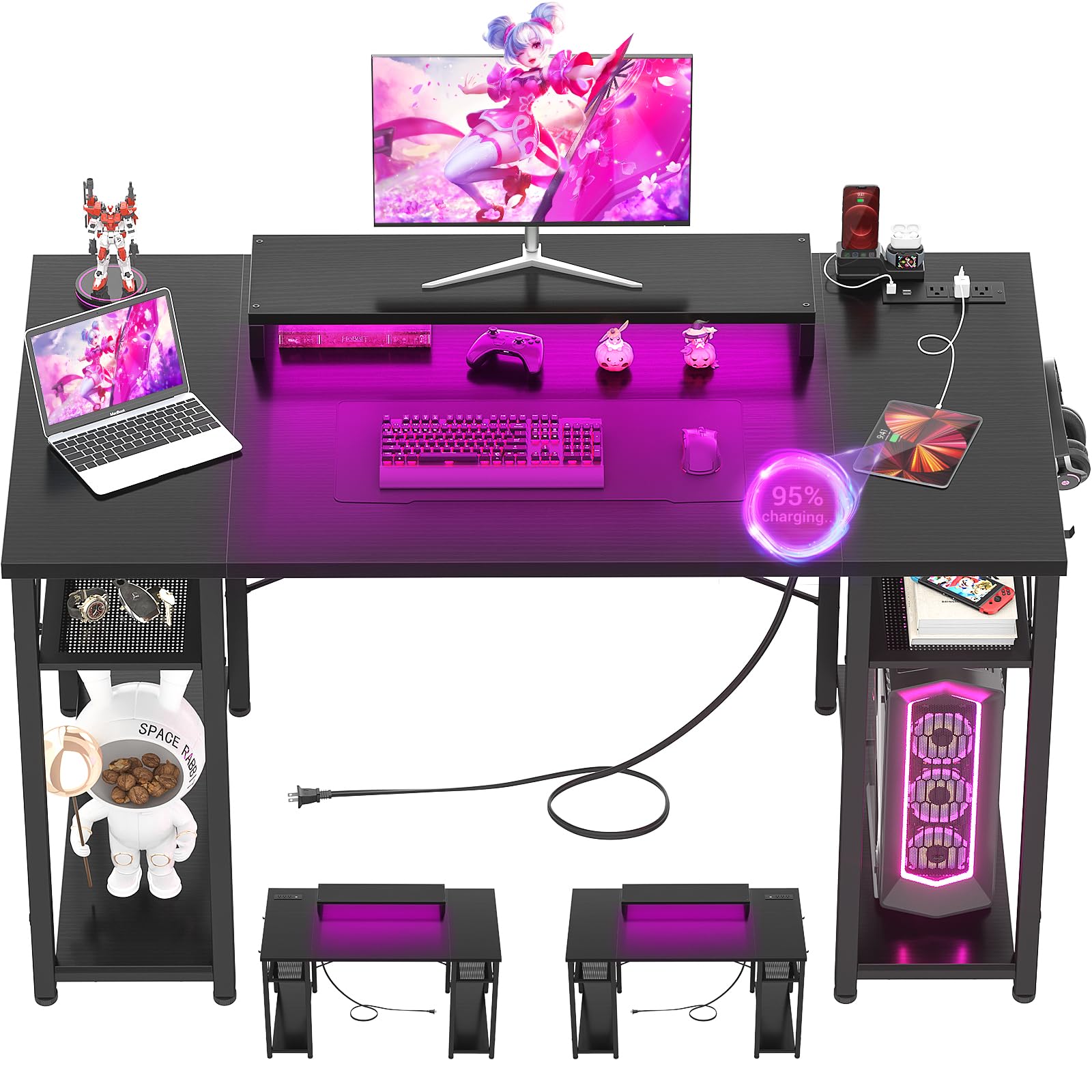 armocity Computer Desk with LED Lights, 48 Inch Reversible Large Desk with Power Outlet and USB, 48'' Gaming PC Table with Moveable Monitor Stand for Home Office, Workstation, Black