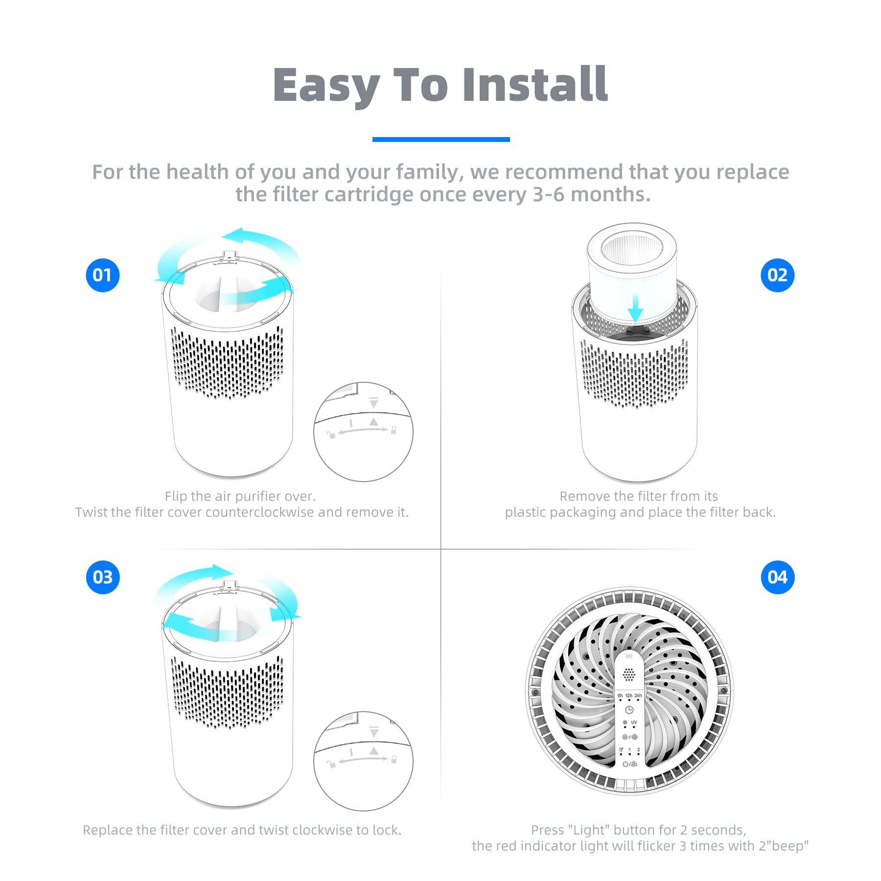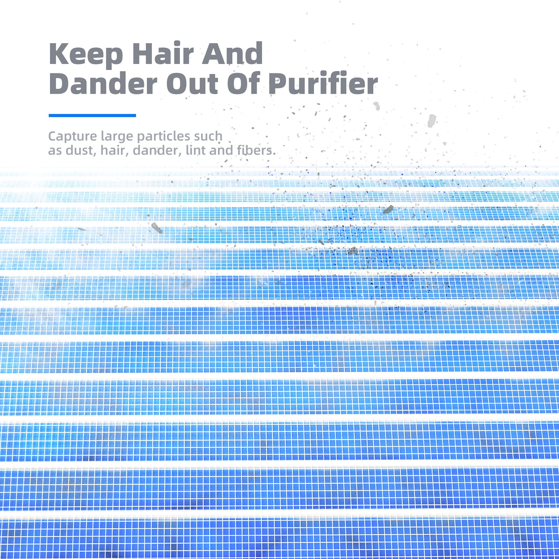 • Prevent Clogging: When hairs, dander, and other large particles meet the pre-filter layer, they will be blocked outside to prevent the air purifier from clogging.