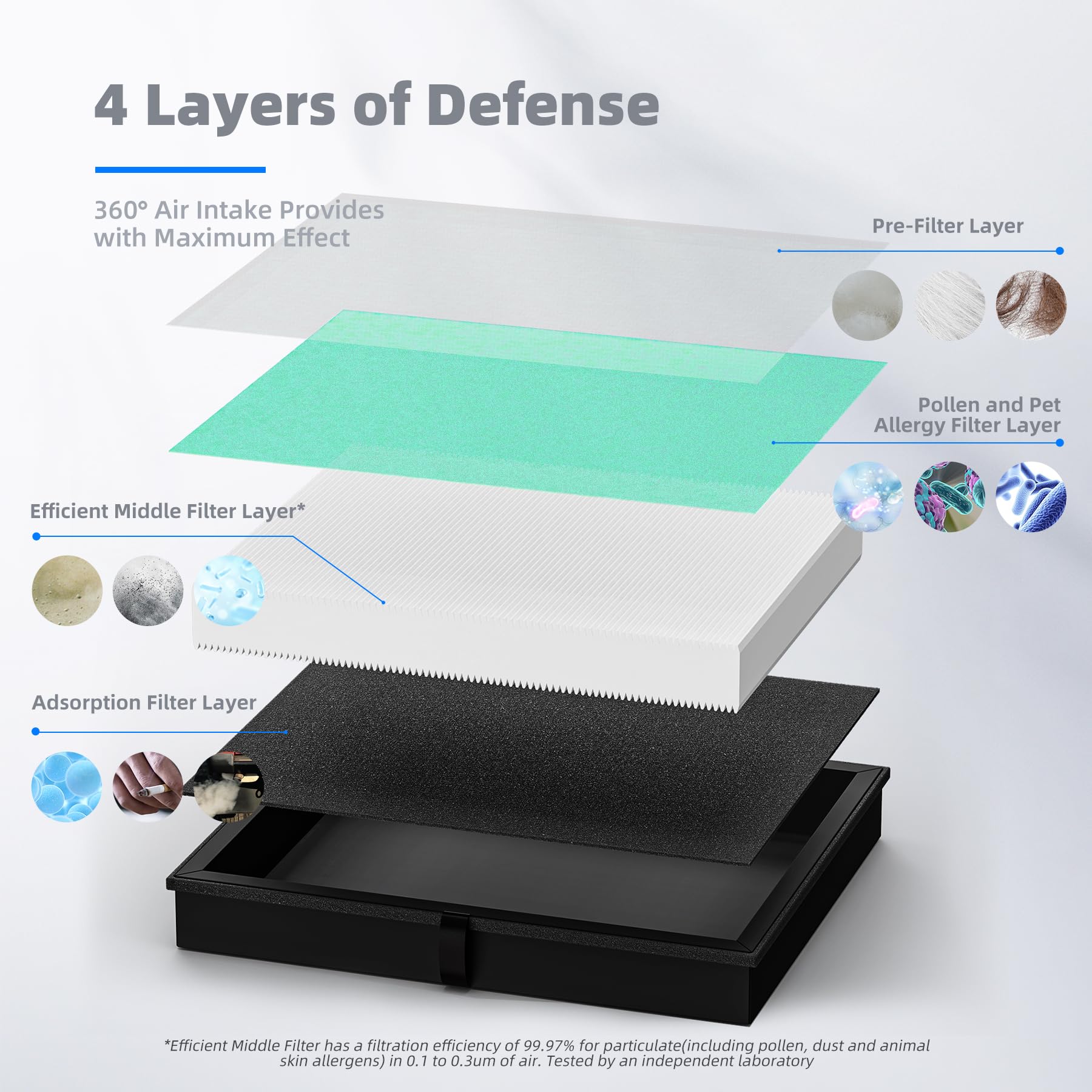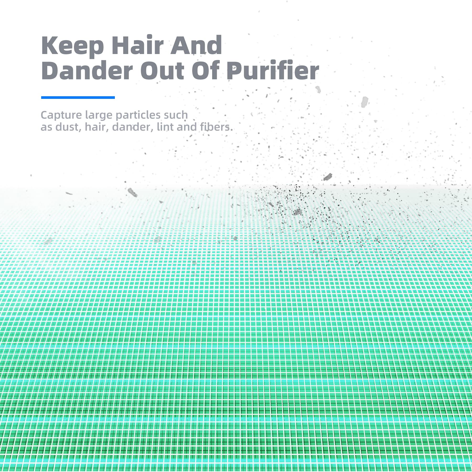 • Prevent Clogging: When hairs, dander, and other large particles meet the pre-filter layer, they will be blocked outside to prevent the air purifier from clogging.
