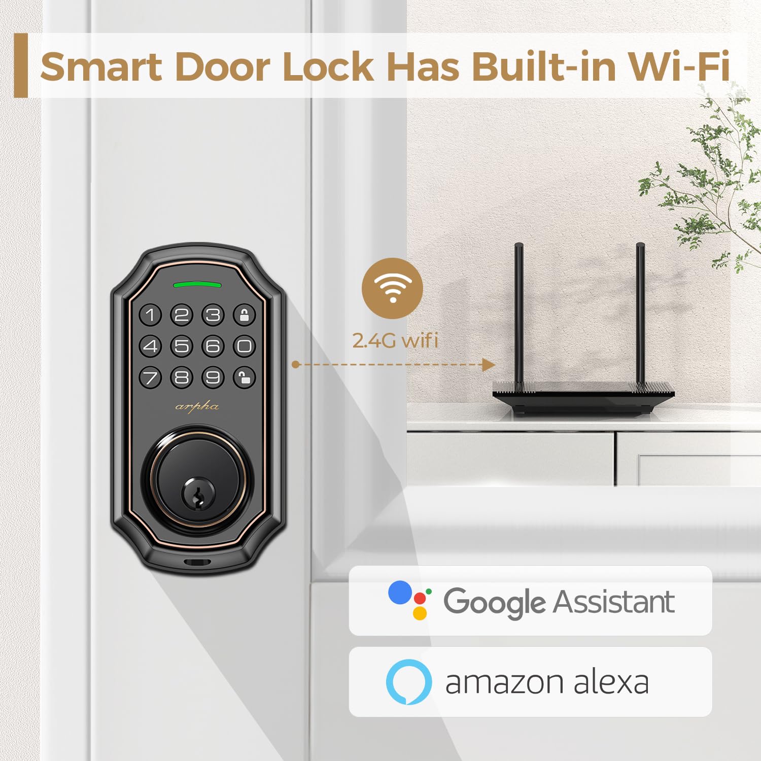 Arpha Keyless Entry Door Lock, WiFi Smart Keypad Front Door Deadbolt, Supports Amazon Alexa Voice Control, Google Assistant, Online App Control, Anti-Peeping Password, One-Time Code, Auto Lock