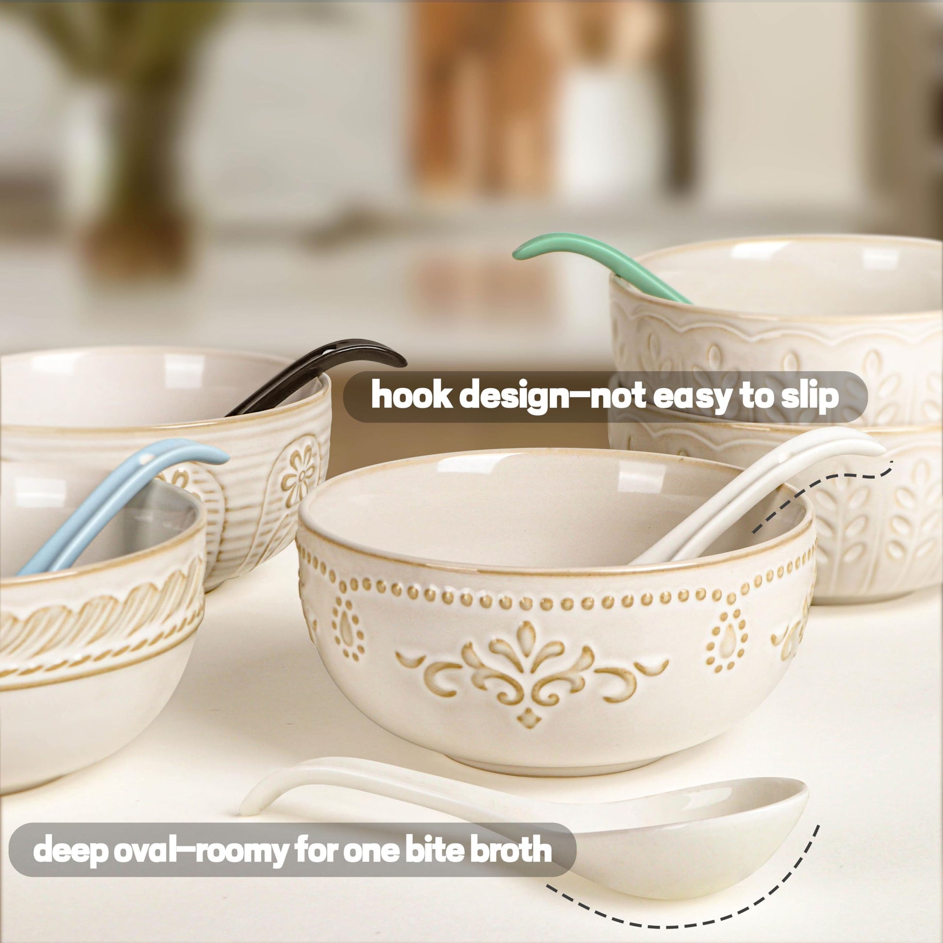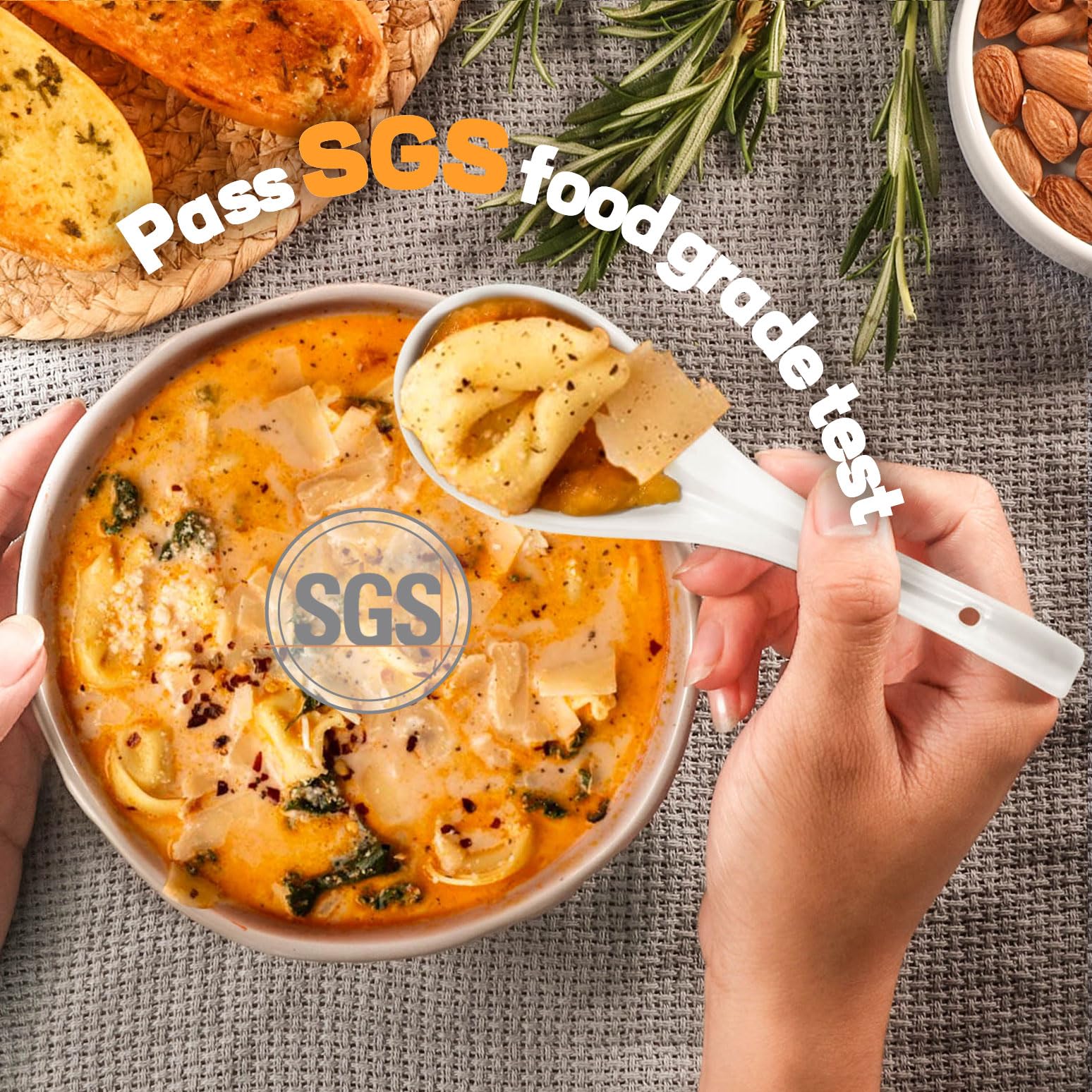 • 【Perfect Size and Versatile】6.75'L, 2'W, proportional length curved handle and deep oval of the tablespoon pocket design are allowing for a more comfortable grip and enjoy your favor dishes and broth in one bite. Roomy and perfect to serve Thai, chili, miso, dumpling, wonton, stews, pho, noodles, cereal, oatmeal, appetizers and more.