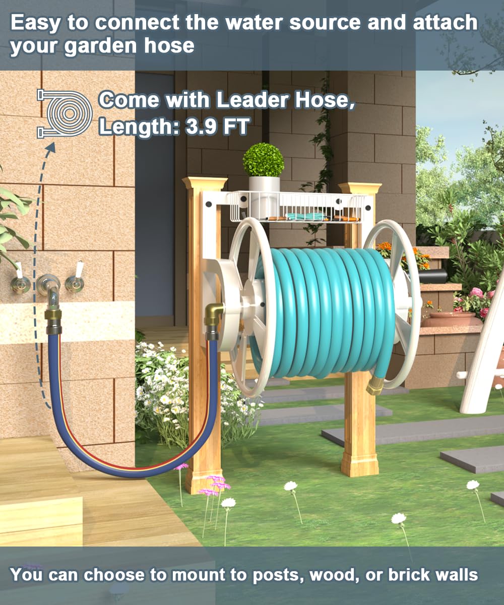 Artigarden Outdoor Garden Hose Reel Wall Mount, Heavy-Duty Water Hose Holder Winder with 3.9 ft Leader Hose, Brass Fitting and Storage Basket for Yard, Holds 125 Feet of 5/8-Inch Hose, White