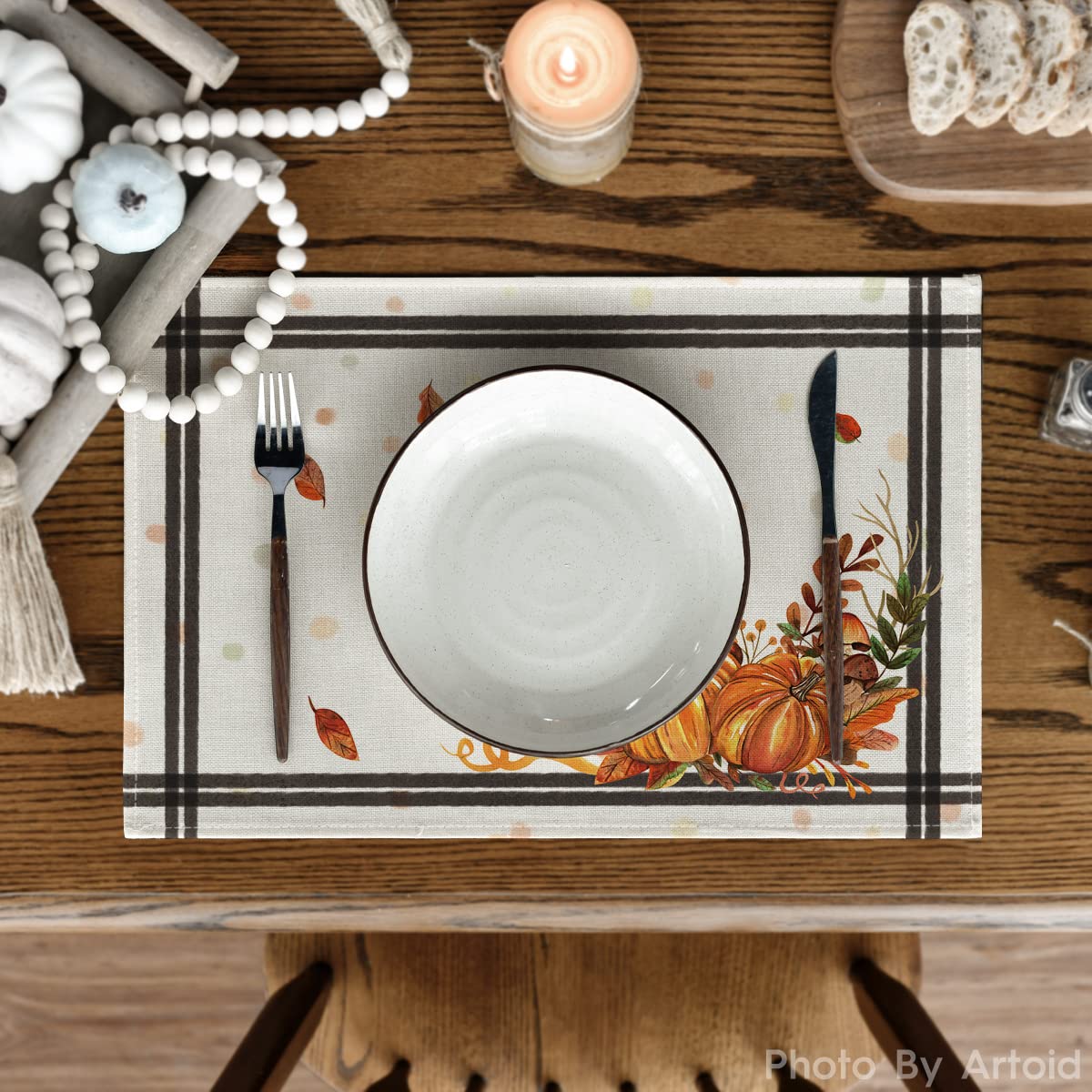 Artoid Mode Pumpkins Mushrooms Leaves Placemat for Dining Table, 12 x 18 Inch Fall Autumn Harvest Holiday Rustic Vintage Washable Table Mat Set of 4