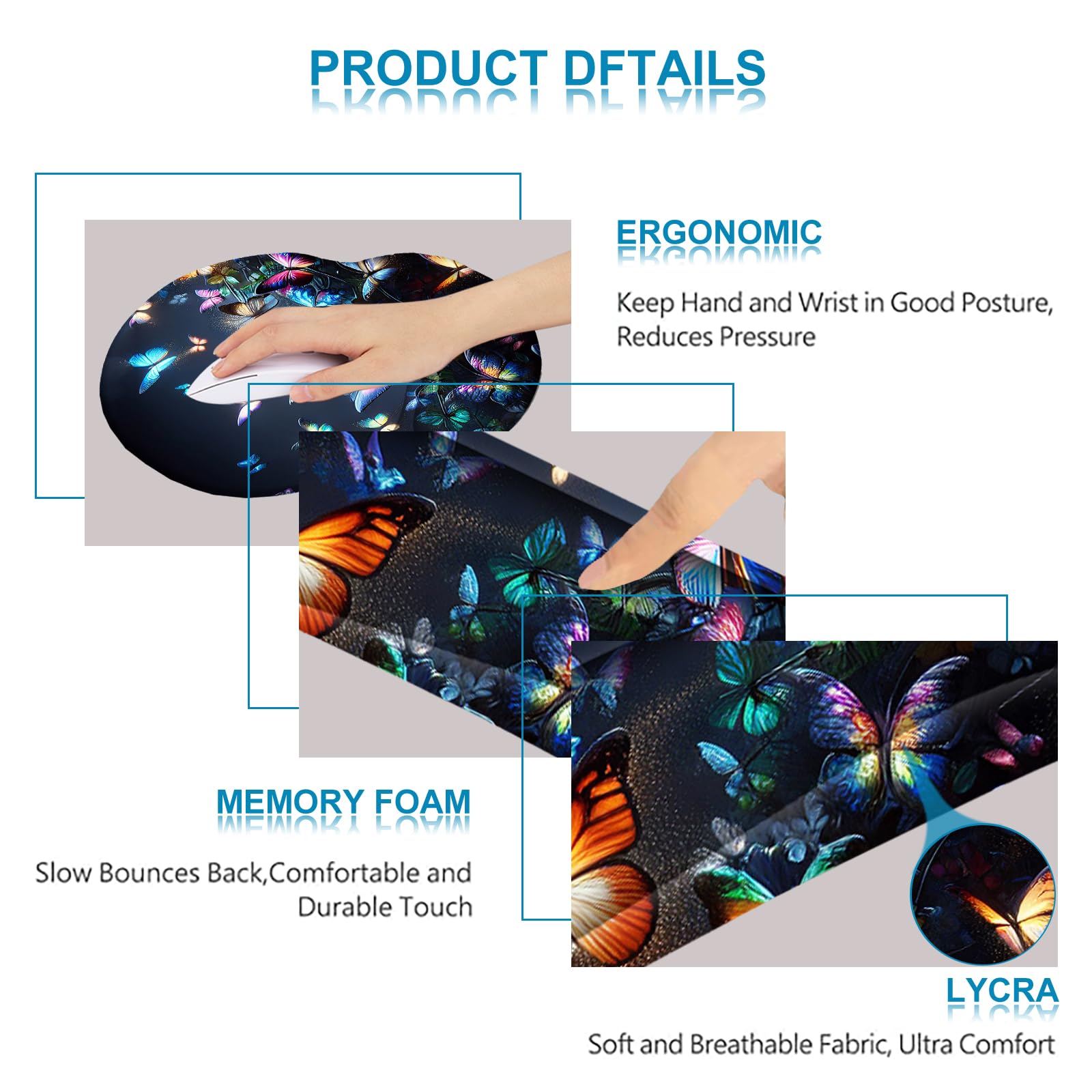 ARTSO Ergonomic Mouse Pad with Wrist Rest, Comfortable Keyboard Wrist Rest, Memory Foam Mousepad for Computer Keyboard, Mouse Pad Set for Easy Typing, Pain Relief, Night Butterfly