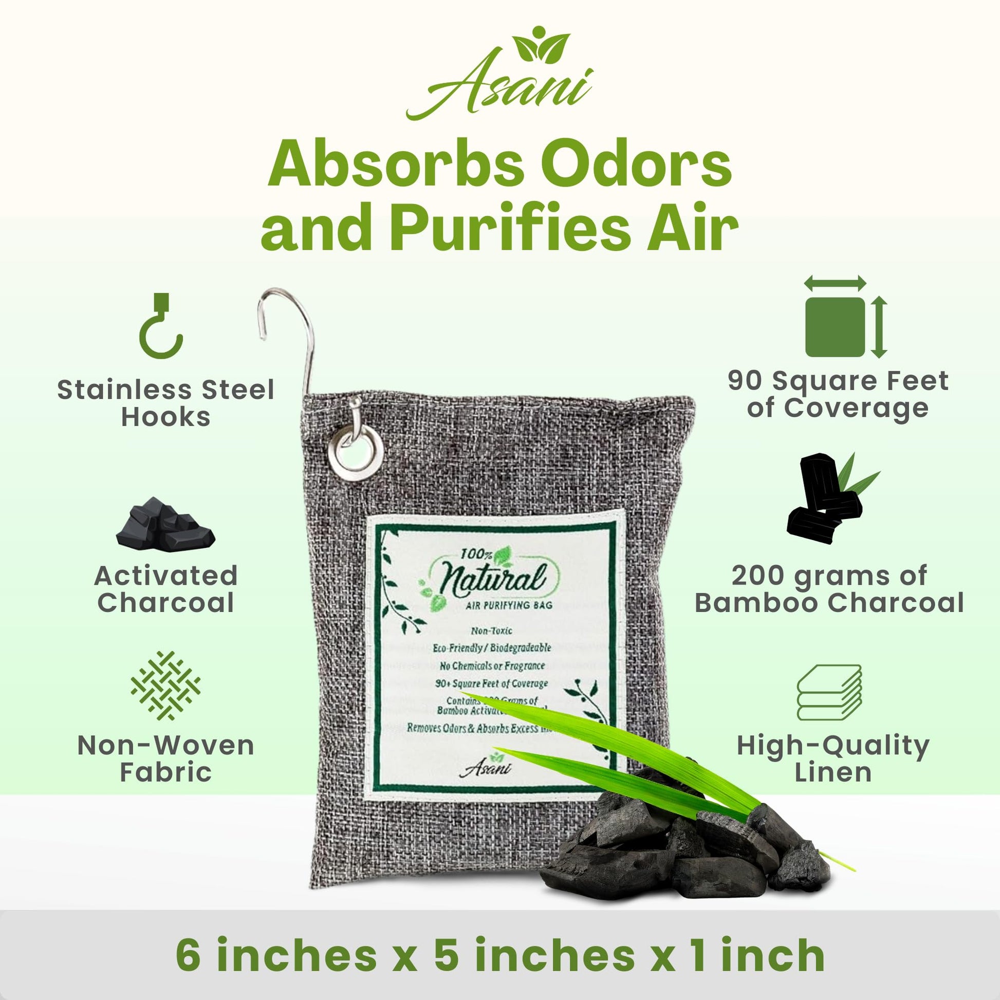 Asani Air Purifier Bags with Bamboo Activated Charcoal (Purifying Pack of 4) | Natural Air Freshener Deodorizer | Moisture Absorber and Odor Eliminators for Home, Car, Refrigerator, Closet (200g Each)