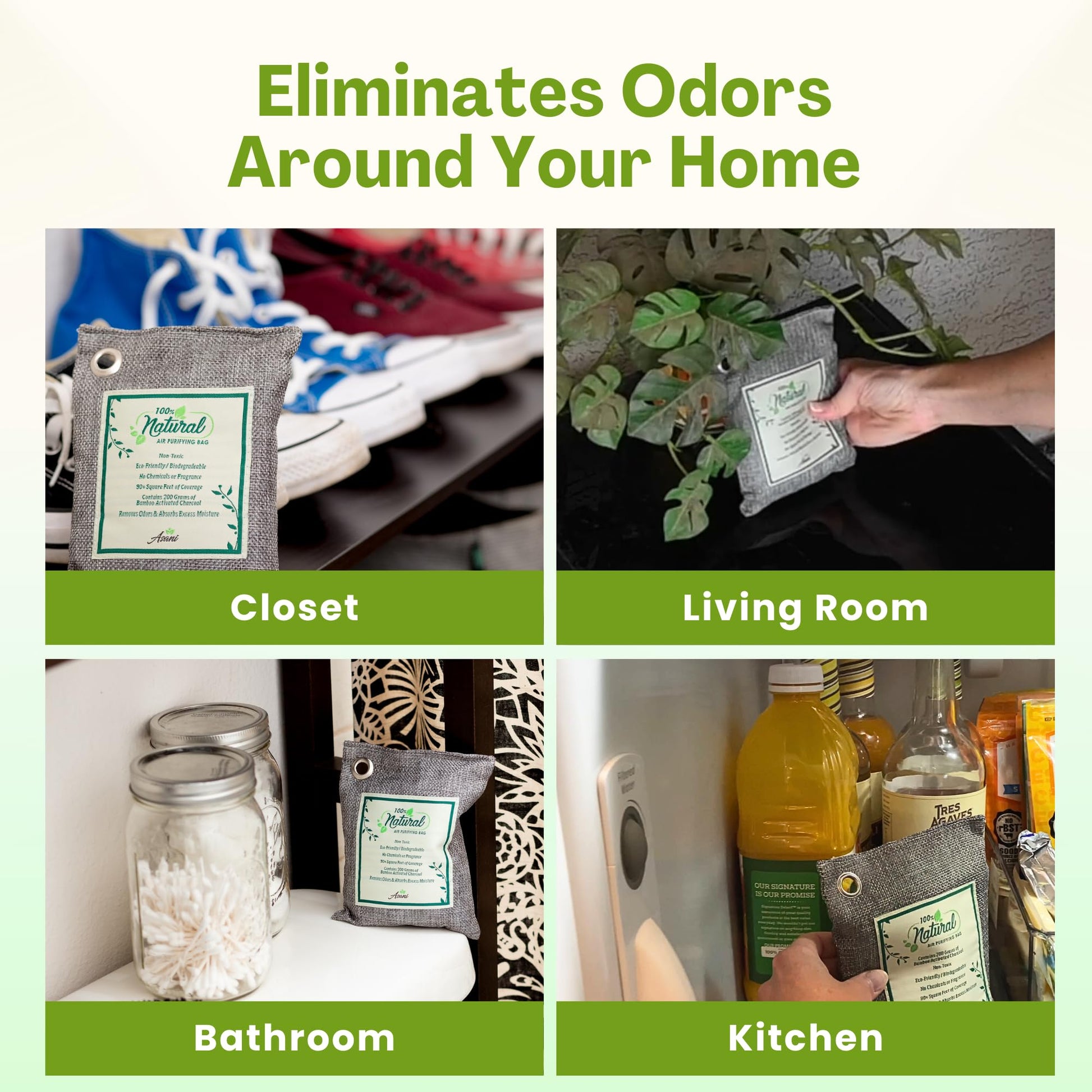 • NO MORE ODORS: Keep your home smelling clean without any fragrances. This bamboo charcoal air purifying bag set comes with 4 (200g) packets that don’t just eliminate odors, they also absorb moisture.