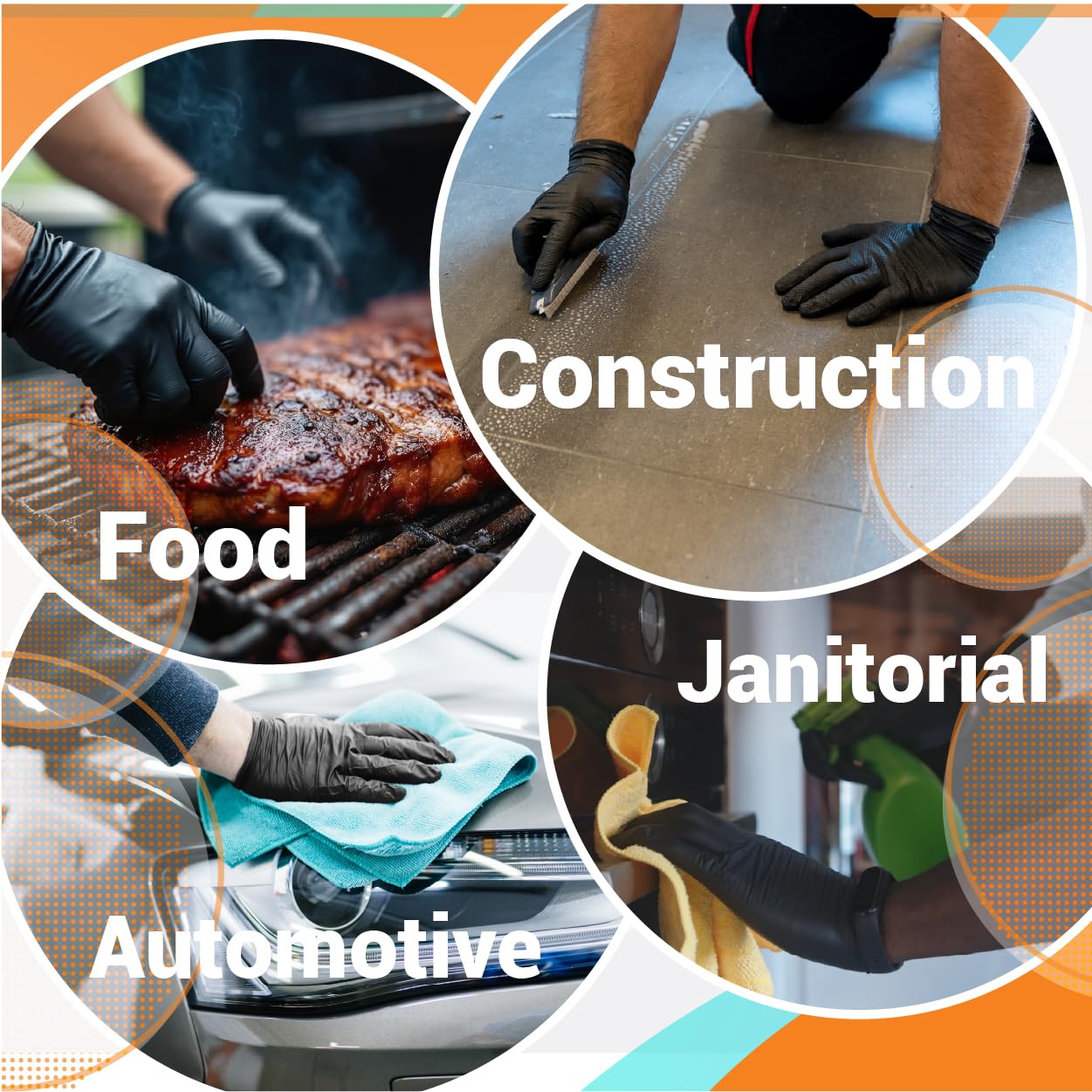 • MULTIPURPOSE GLOVES: Our nitrile black gloves offer exceptional quality, flexibility, comfort, and protection for a wide range of applications. Great for use as industrial nitrile gloves, black mechanic gloves, food handling gloves, black food prep gloves, nail tech gloves, hair stylist gloves, black barber gloves, car detailing gloves, and more!