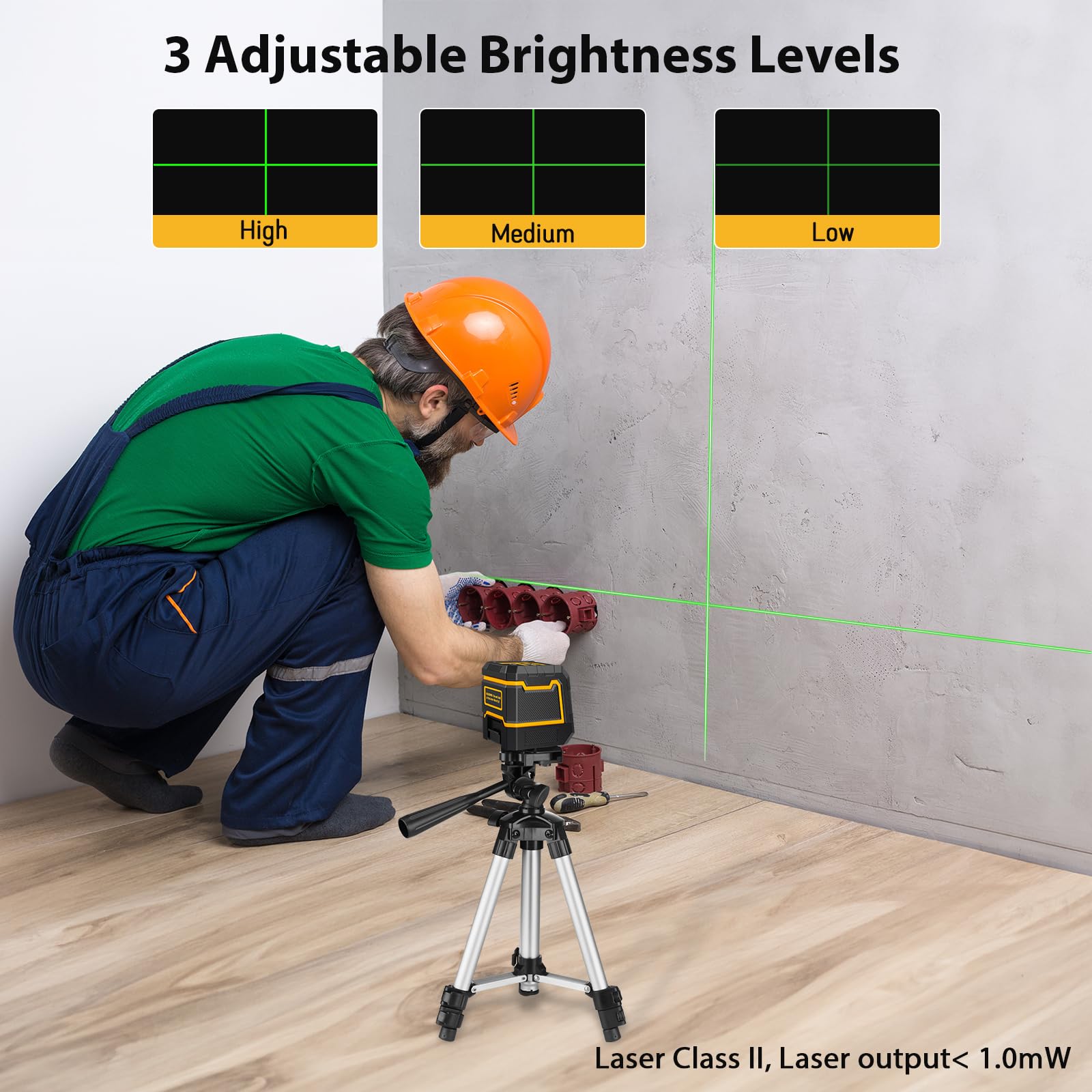 • 【Maintenance & After-Sale Service】The laser level tool covers ONE-YEAR exchange and LIFETIME guarantee. For any product question, don't hesitate to communicate us, we will respond to your needs within 24 hours. Package includes 1 x Green Cross Line Laser, 1 x Aluminum Compact Tripod, 2 x AA Batteries, 2 x Instruction Manual. Class ll laser product, maximum laser output < 1mW.