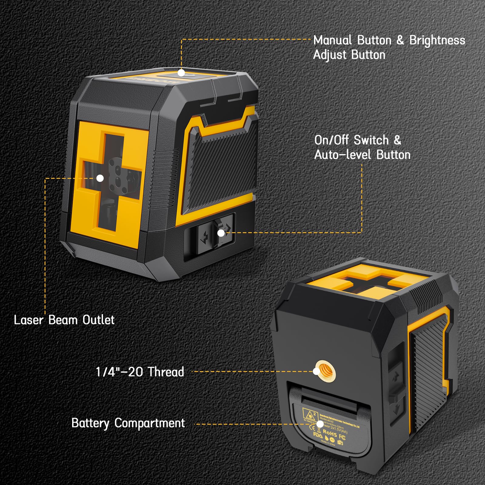 • 【2 Modes Switch 】Simply slide the pendulum to the 'ON' position to switch to [self leveling mode]. If beyond ± 4 °, this laser tool will flash constantly to remind. Slide the pendulum to the 'OFF' position, press and hold the top button 3s, it will enter [Manual Mode], which will not flash at any angle. Sliding switches are very suitable for users without DIY experience, and anyone can easily operate them.