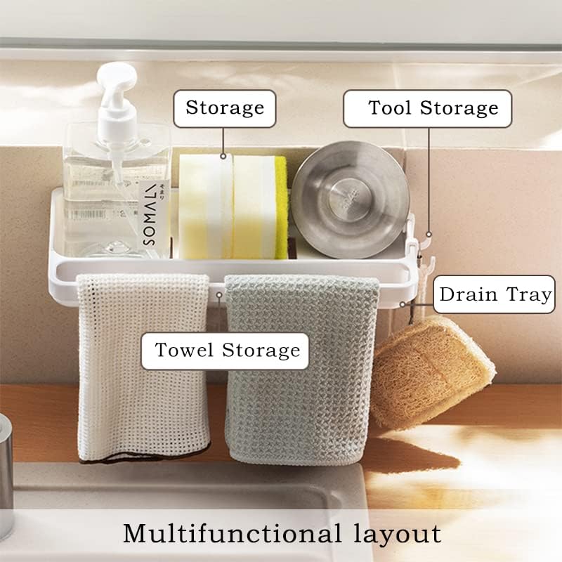 • 【Convenient and Hygienic】Our Kitchen Sponge Holder features a removable drip tray, allowing easy management of stagnant water and preventing bacterial growth. The Sink Organizer includes a towel holder to keep towels dry and odor-free. Additionally, two side hooks provide extra storage space for kitchen utensils, optimizing your countertop organization.