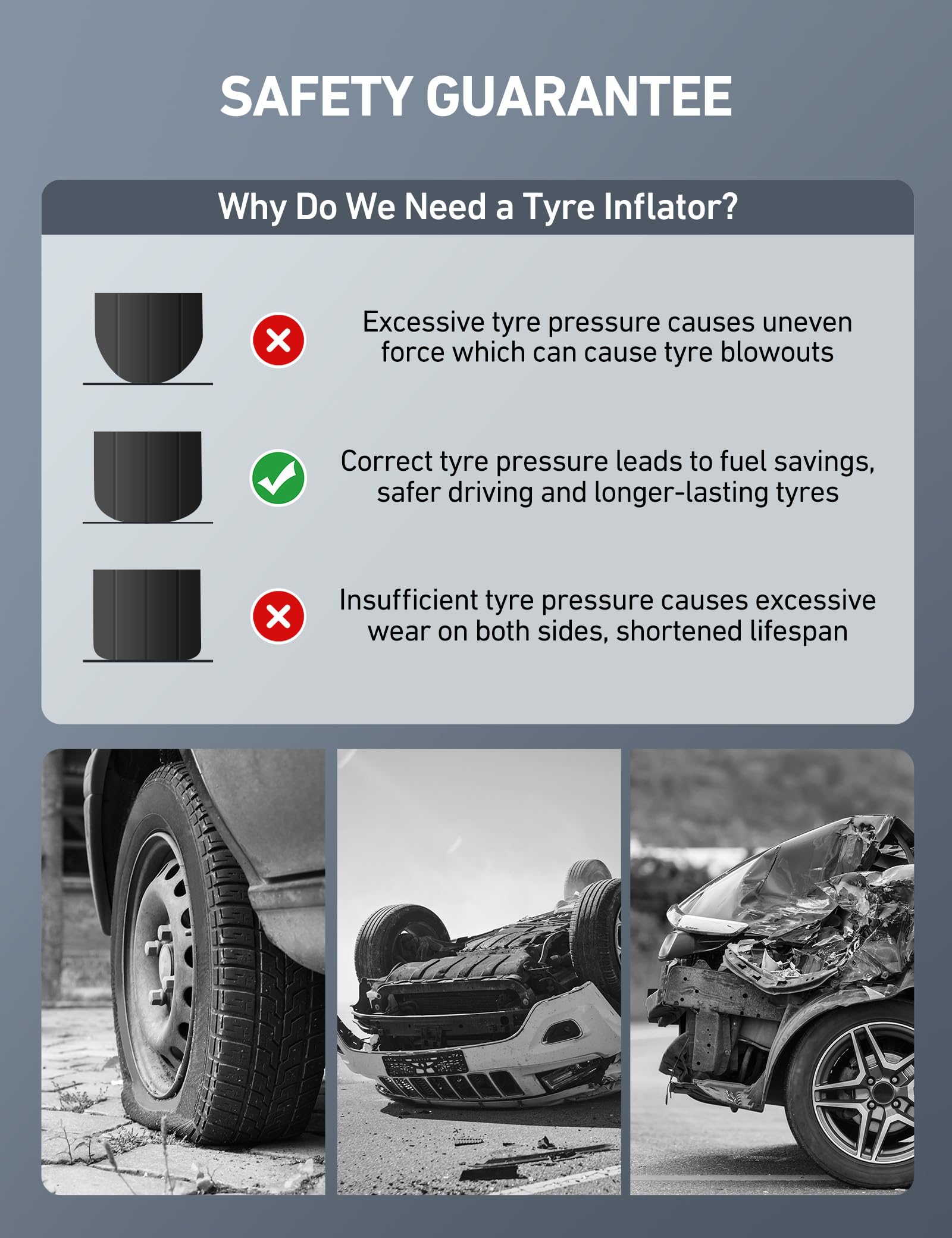 • INCREASED SAFETY: Properly inflated tires provide better performance in all weather conditions, decrease the likelihood of flats, explosions, and crashes; Increase your MPG, save money on fuel/tire wear, and drive safer.