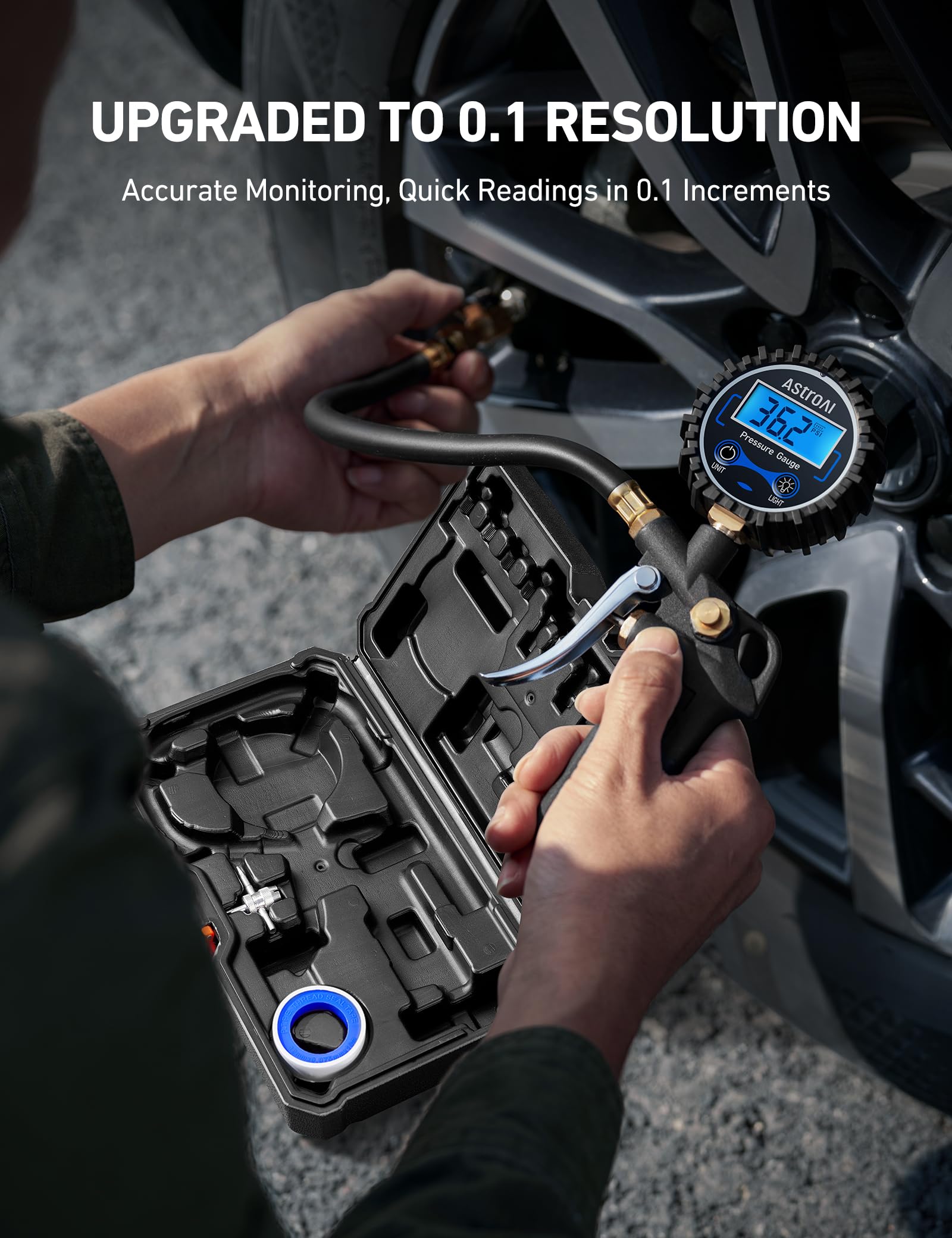 AstroAI Digital Tire Pressure Gauge with Inflator, 3-250 PSI Air Chuck & Compressor Accessories Heavy Duty with Quick Connect Coupler, 0.1 Display Resolution (Standard with Case)