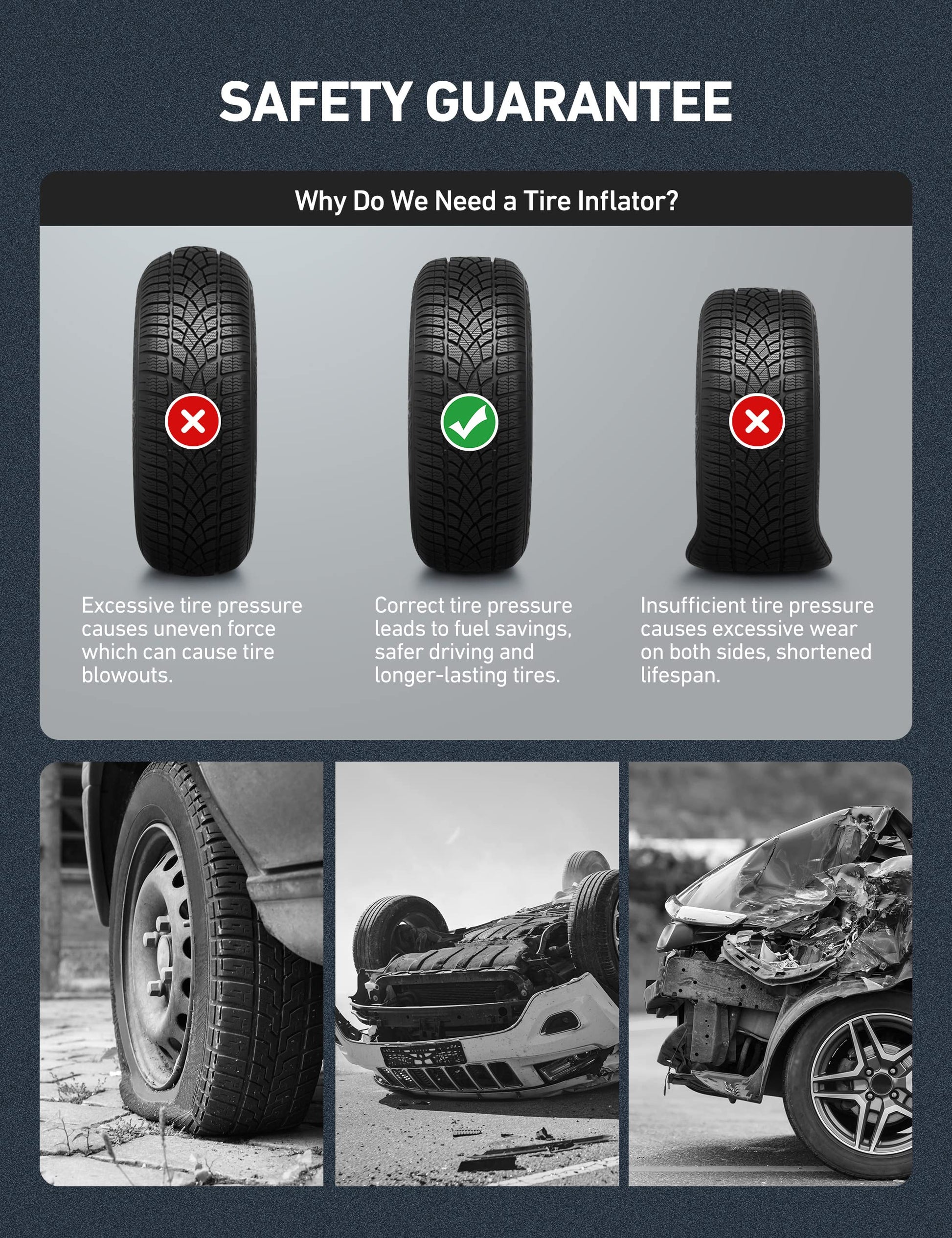 • INCREASED SAFETY: Properly inflated tires provide better performance in all weather conditions, decrease the likelihood of flats, explosions, and crashes; Increase your MPG, save money on fuel/tire wear, and drive safer.