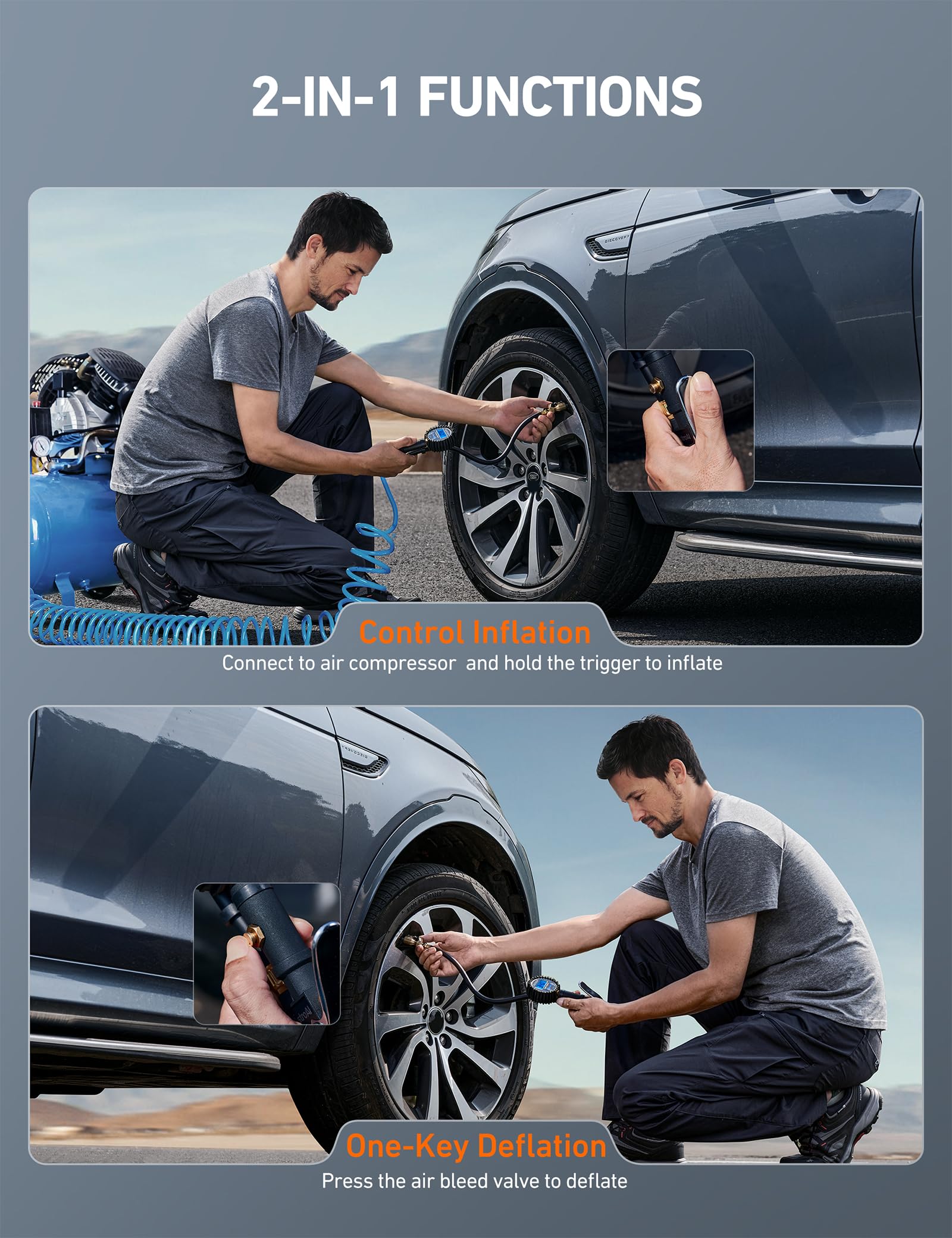 • ALL-IN-ONE FEATURES: The LED backlit screen features measurements in PSI, KPA, Bar, and Kg/cm^2; Includes an inflator, straight locking chuck, gauge, hose, bleed valve, all in one unit, ideal for cars, bicycles, motorcycles, balloons, air cushion, sports balls and so on; Compatible with ¼” NPT air compressors output and ¼' NPT Quick- Connect Fitting.