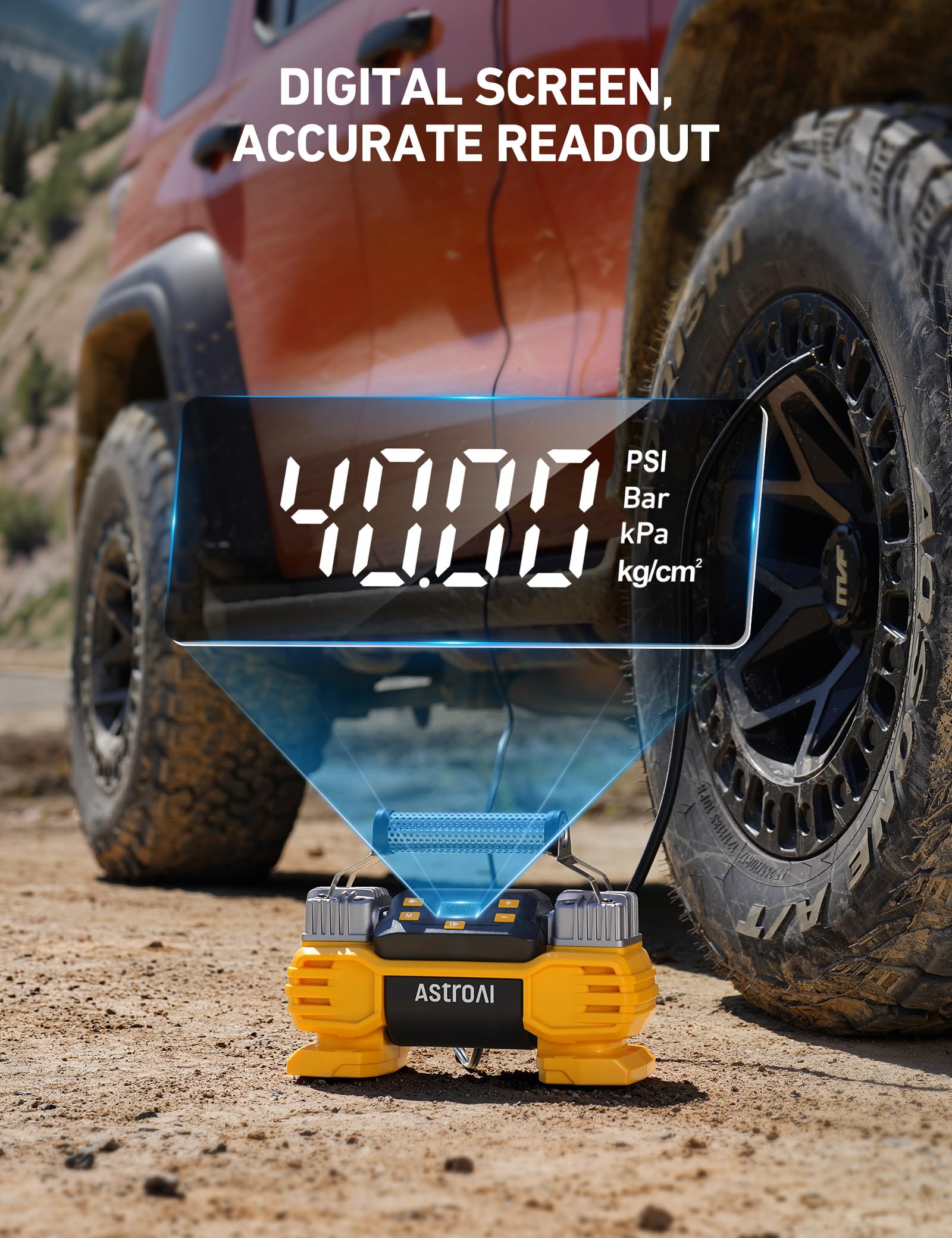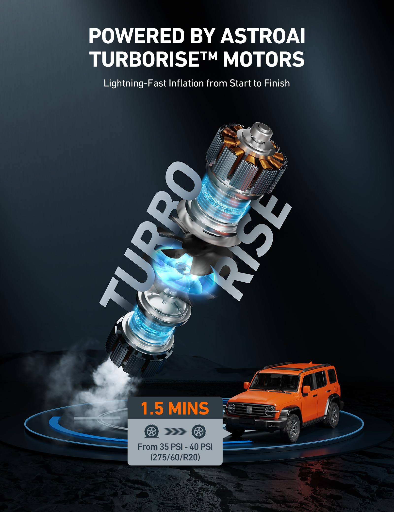 • CONSTANT HIGHLY-EFFICIENT OUTPUT: AstroAI’s revolutionary TurboRise technology incorporates advanced manufacturing techniques and high-quality materials, like pure copper wires and ferrite, to produce powerful, reliable, and efficient motors. These mighty motors achieve high outputs, even under high pressure, capable of inflating an SUV tire from 35 PSI to 40 PSI in 1.5 minutes. (275/60/R20)This tire pump is suitable as Father's Day presents.