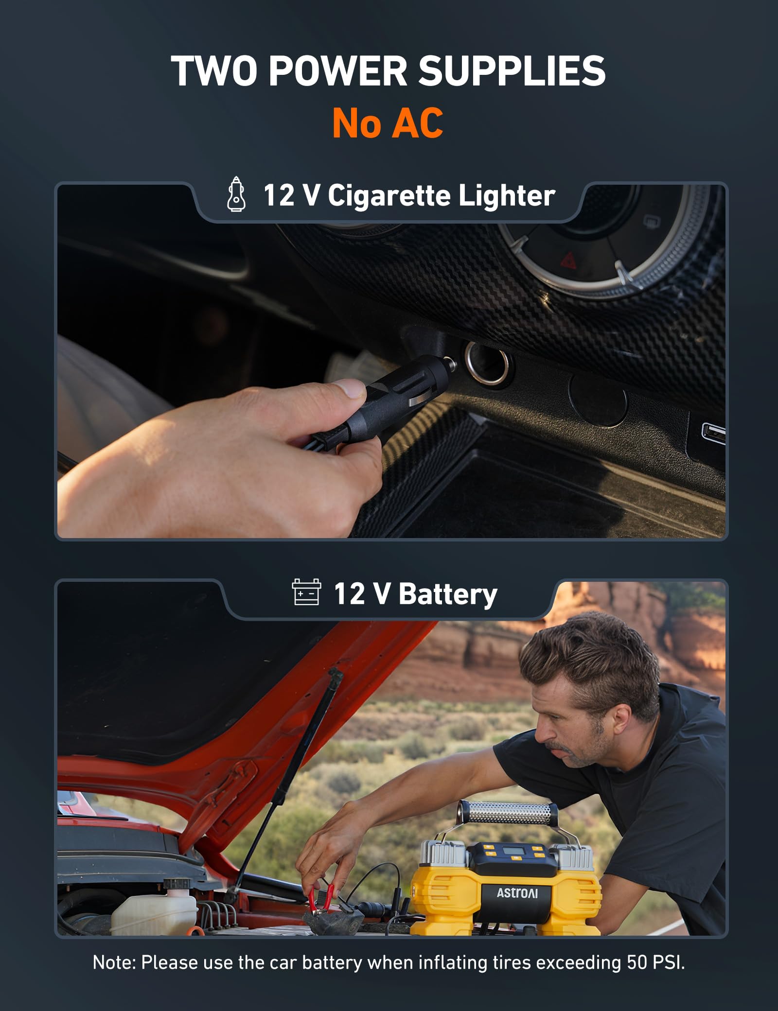 • INFLATE WITH FREEDOM: The extra-long 16.4’ air hose and 11.5’ power cord easily reach any tire on heavy-duty vehicles. Its supplies a 12 V cigarette lighter plug and 12 V battery clamps(NO AC), provide additional accessibility. Note:to inflate tires above 50 PSI, please use the car battery as a power source.