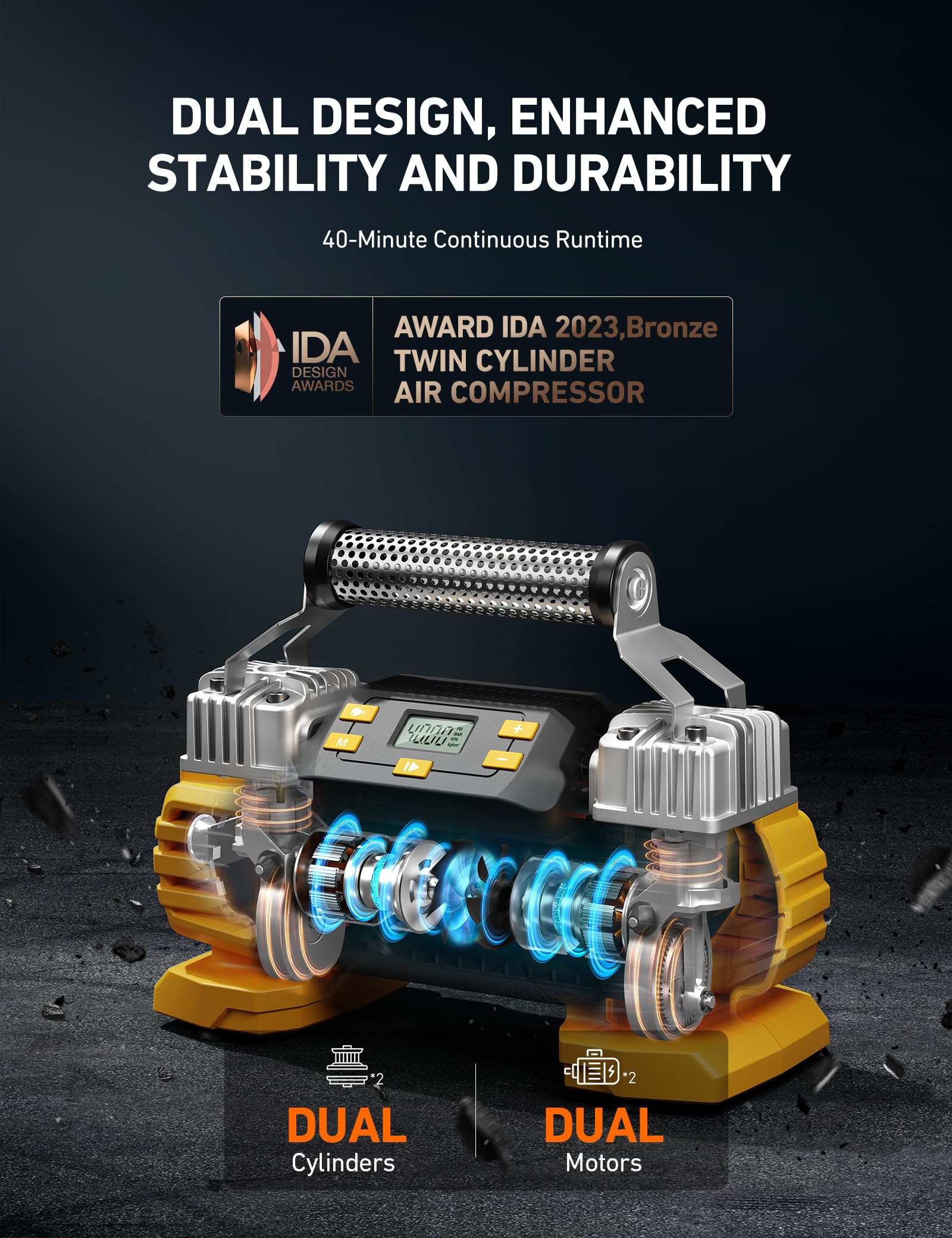 AstroAI Portable 160 PSI DC Heavy Duty Tire Inflator Pump Auto Shutoff with Screen, Dual Cylinders & Dual Motors, 12V Air Compressor for SUVs, RVs, ORVs, Cars, Air Mattresses, etc. Yellow(NO AC)