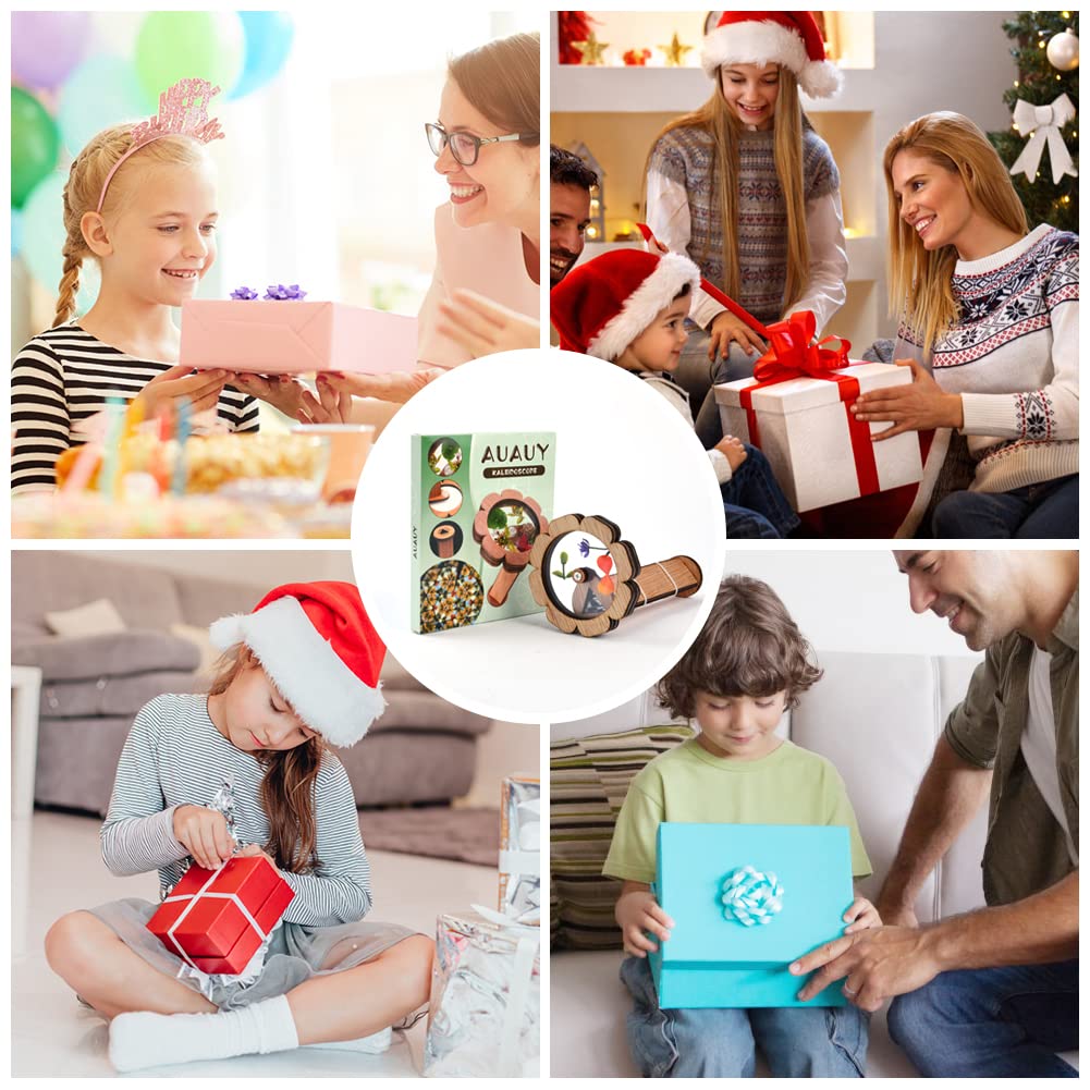 • 🎁【GREAT GIFT】DIY Kaleidoscope Just rotate the barrel to enjoy unlimited color patterns. Each round will create magical, intricate and symmetrical mosaics that will dazzle children of all ages. This wooden kaleidoscope kit is a great gift choice for family, kids and friends for Christmas, birthdays, parties and other important days. Children will be delighted to receive this gift.