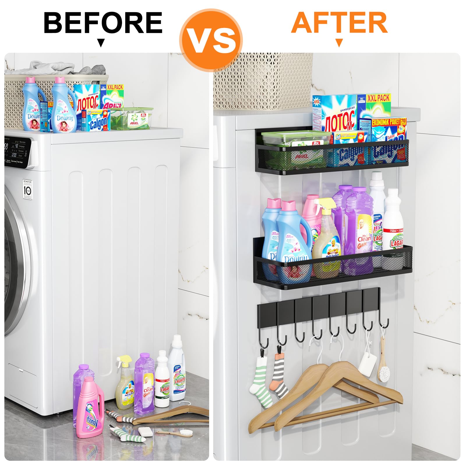 • Magnetic Spice Rack for Refrigerator: Aufworld Magnetic Spice Racks Set comes with 2 separate shelves and an 8 hook rack, which is more diverse in the market. Practical 8-hook hanger can be hung with various laundry supplies or kitchen utensils like cup, scissors, apron, towels etc.
