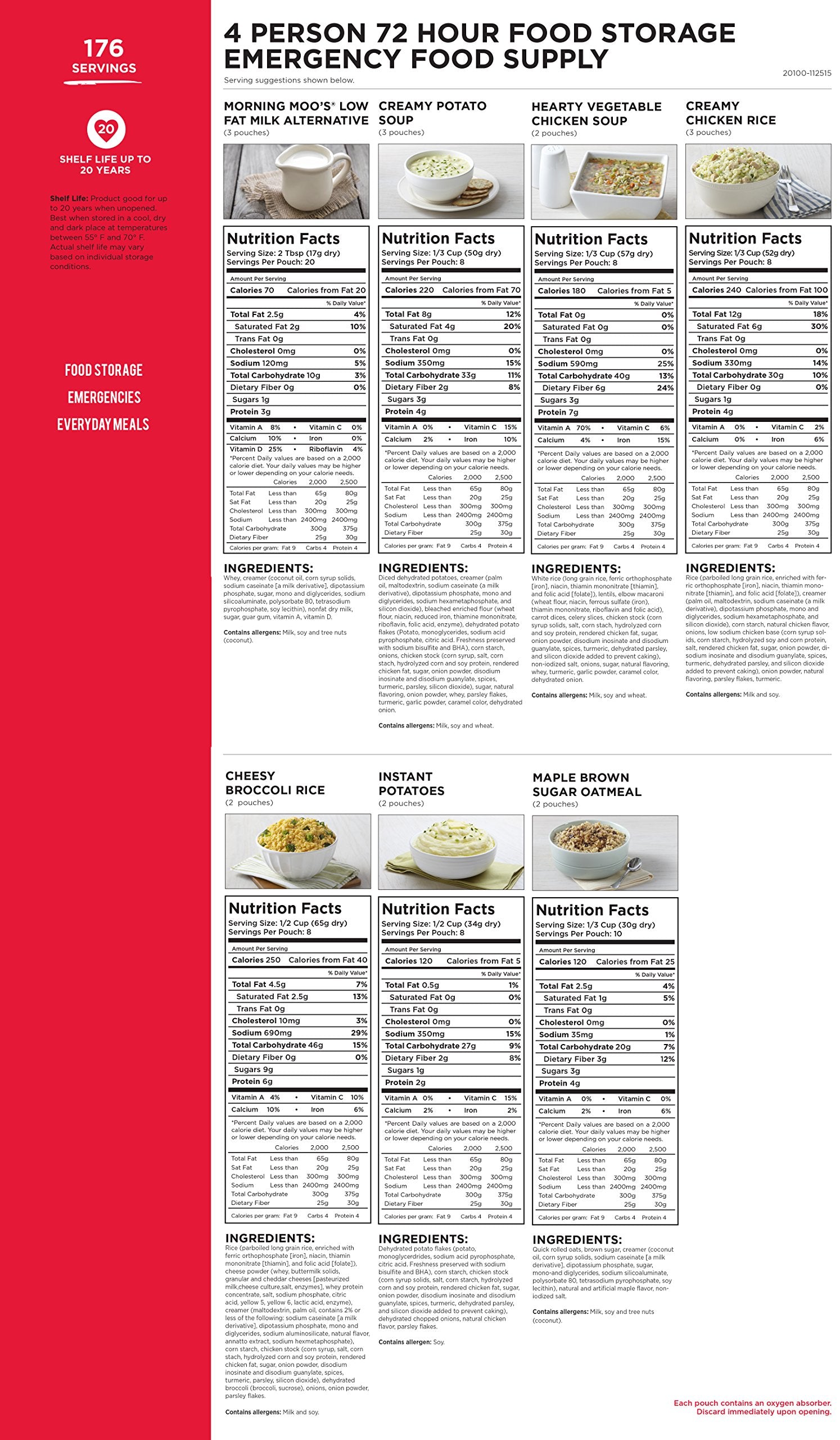 Details: The Augason Farms 72-Hour 4-Person Emergency Food Pail includes 7 meal varieties with 16 individual food pouches. At an average of 2,203 calories per person, per day, this is ample calories to feed 4 people for 3 days (or, alternatively, feed 1 person for 12 days). All food is packaged in individual food pouches (4 to 20 servings per pouch) and sealed in easy-to-transport pails. Just add water and cook. The delicious meals are easy to prepare and nutritious and, with an extended shelf life, offer your family a convenient solution for preparing meals when the kitchen at home isn't an option. It’s disaster preparedness insurance for cabins, boats, and even to put in your vehicle. The 72-Hour 4-Person Kit is contained in a 4-gallon watertight pail including 176 servings and 26,440 total calories. Augason Farm's products are an excellent choice for food storage, emergencies, survival, camping and everyday use! Family owned and operated since 1972, Augason Farms believes that great taste is a tradition worth preserving. Crafted with a focus on taste and nutrition, their products are manufactured to the highest standards. Whether enjoying Augason Farm’s products for everyday meals, as an emergency food supply, or years down the road. Make the wise decision and let Augason Farms’ food essentials give you a peace of mind that's as indispensable as it is delicious. *Product good for up to 20 years when unopened. Best when stored in a cool, dry and dark place at temperatures between 55°F and 70°F. Actual shelf life may vary based on individual storage conditions. Please remove and discard oxygen absorber after opening.