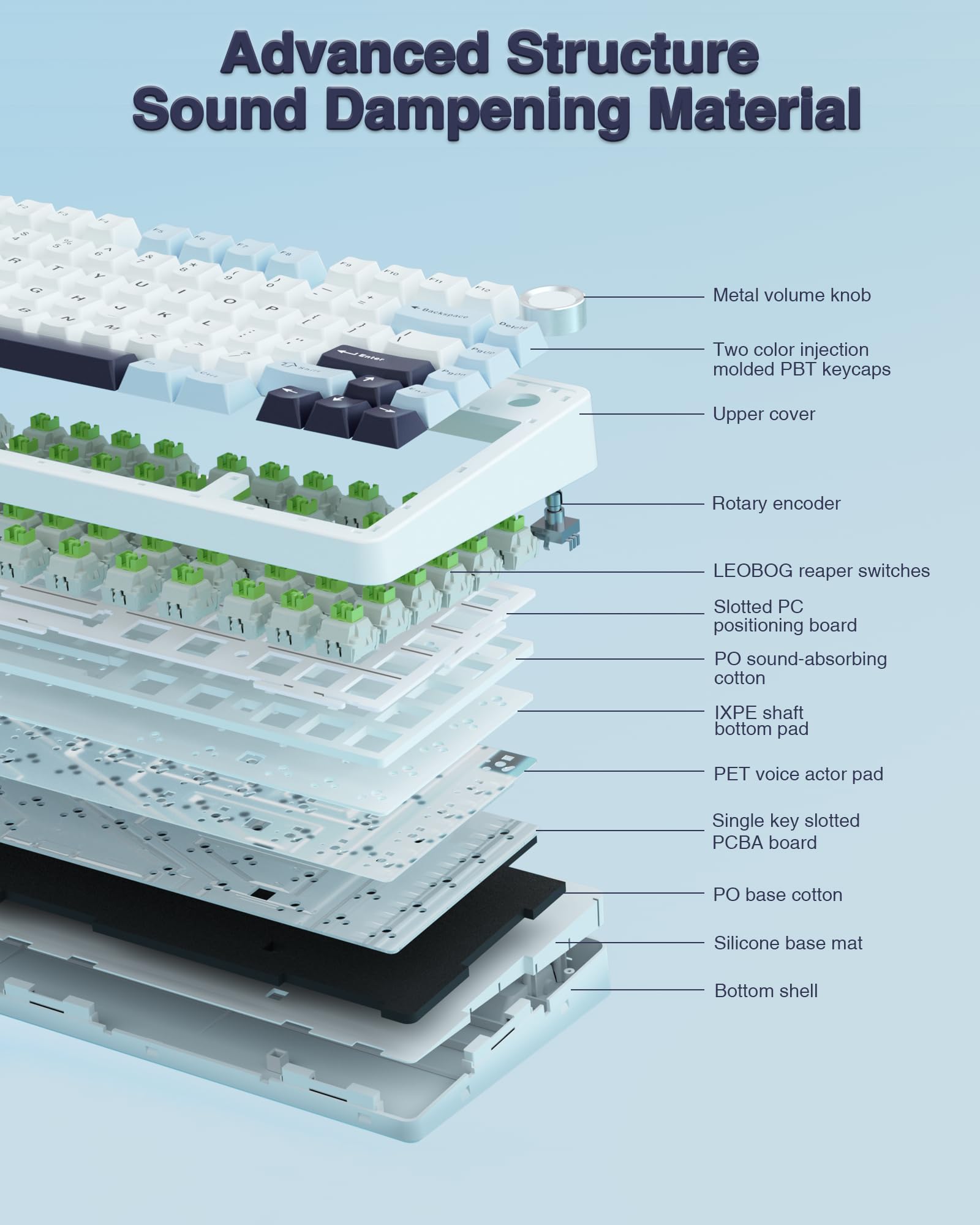 • Hot-swap Custom Keyboard: This custom mechanical keyboard with hot-swappable base supports 3-pin or 5-pin switches replacement. Even keyboard beginners can easily DIY there own keyboards without soldering issue. F75 gaming keyboards equipped with pre-lubricated stabilizers and LEOBOG reaper switches, bring smooth typing feeling and pleasant creamy mechanical sound, provide fast response for exciting game