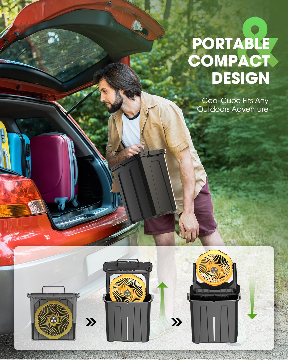 • ⭐【Dual-Purpose Water Bucket】- The portable fan is housed in a 9L bucket, which doubles as a storing and carrying case when not in use. During use, the bucket acts as a water tank, with the built-in pump supplying water to the mist nozzles☻ Kindly note: Avoid pinching the water tube while using or moving the fan.