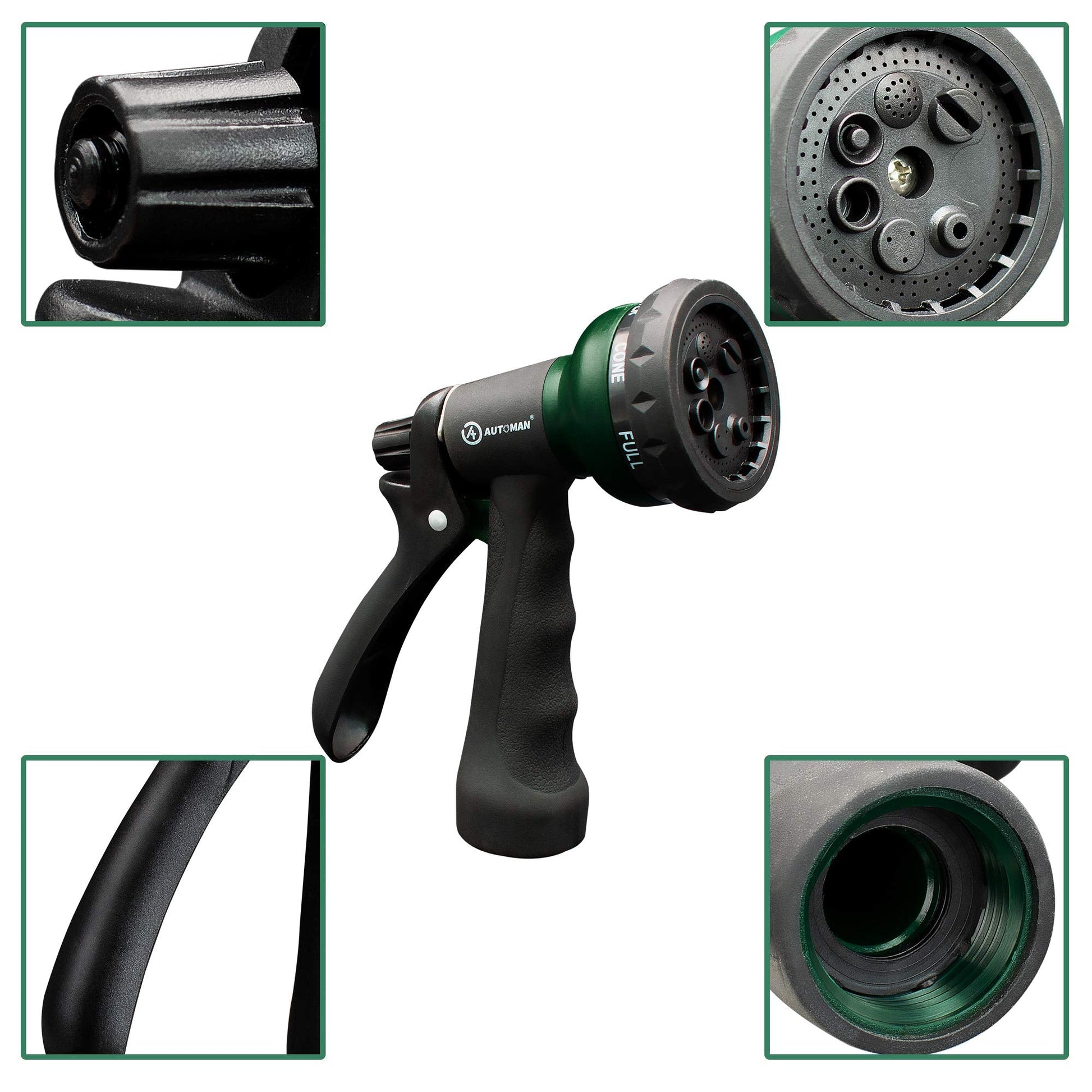 • LABOR-SAVING DESIGN: AUTOMAN garden nozzle features a nice lock bar at the top of the handle that keeps the water remains on without you having to apply any pressure.Just use the lock so you don't have to keep your hand holding it the whole time.