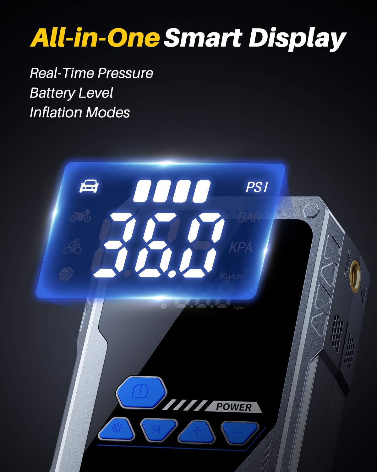• 【High-Performance Air Compressor】Integrated with a high-performance air compressor, this jump box for car battery inflates tires for cars, motorcycles, bicycles, and more at 45 liters per minute. It quickly boosts tire pressure, such as inflating a pickup truck tire from 30PSI to 36PSI in just 2.5 minutes, ensuring optimal tire performance on the go. This versatile car jump starter with air compressor meets all your inflation needs.