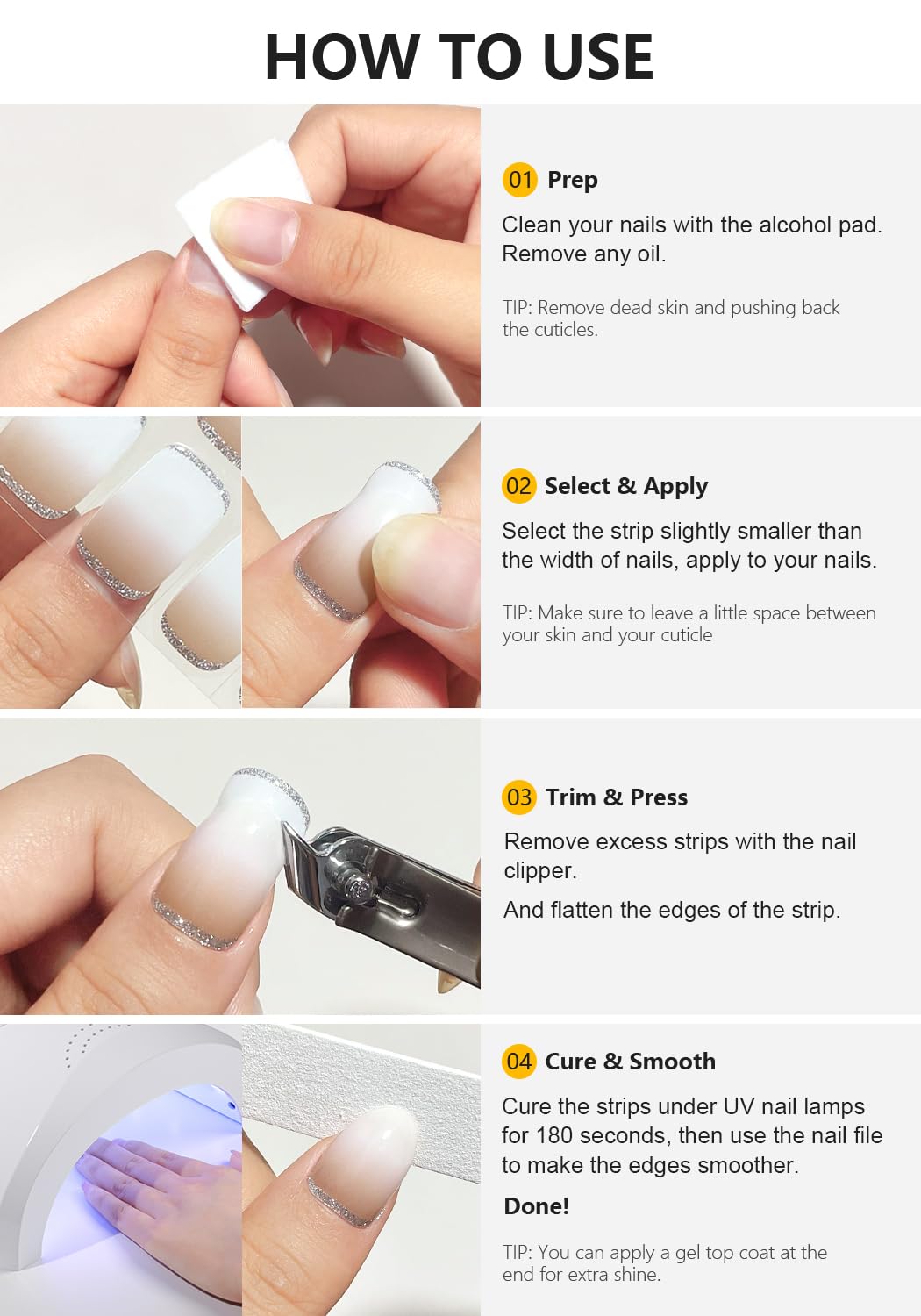 • 【Salon-Quality】- Our semi cured nail strips are cured 60% in advance to keep nail strips soft and flexible. Once cured under a UV or LED lamp, you can enjoy salon-quality nails for up to 2 weeks. Kind reminder: not suitable for nail extension.