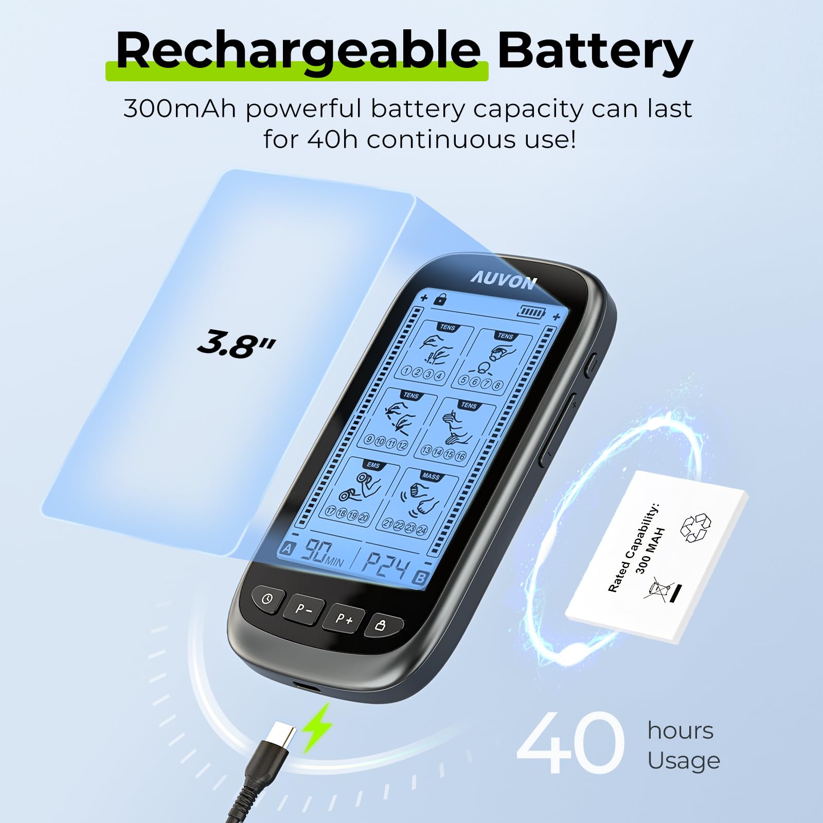 • Continuous 40 Hours Relief: The rechargeable TENS unit equipped with a powerful 300mAh battery delivers consistent relief for 40 hours. The package includes a Type-C cable (No Adapter) that can be connected to a wall charger, power bank or laptop USB port to charge. No more worries about treatment interruption for dead AAA batteries anymore