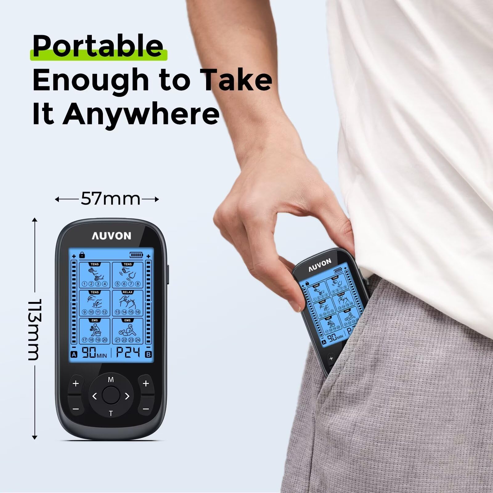 • What You Receive: 1 x Dual Channel Electrodes Muscle Stimulator, 8 x Square 2' TENS Machine Pads, 4 x Large Rectangular 2' x 4' Pads, 2 x Lead Wires, 1 x Pads Holders, 1 x Type-C Cable, 1 x User Manual, AUVON 24-month warranty support, and friendly customer service