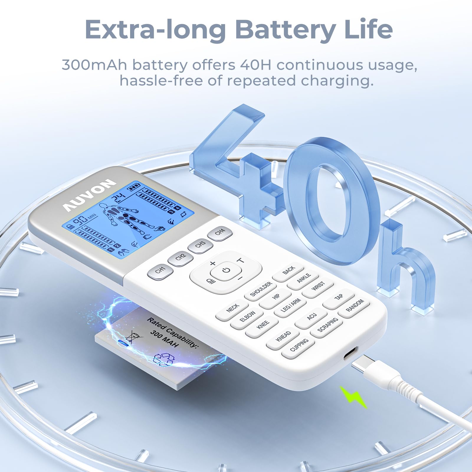 • Bigger Battery, 2X Battery Life. No worries about usage interruption for dead AAA batteries any more! It has a 300mAh rechargeable battery to last up to 40h standby time, which beats other TENS with 180mAh by 20h. (Charge it with your wall charger, power bank or laptop using the included Type-C cable)