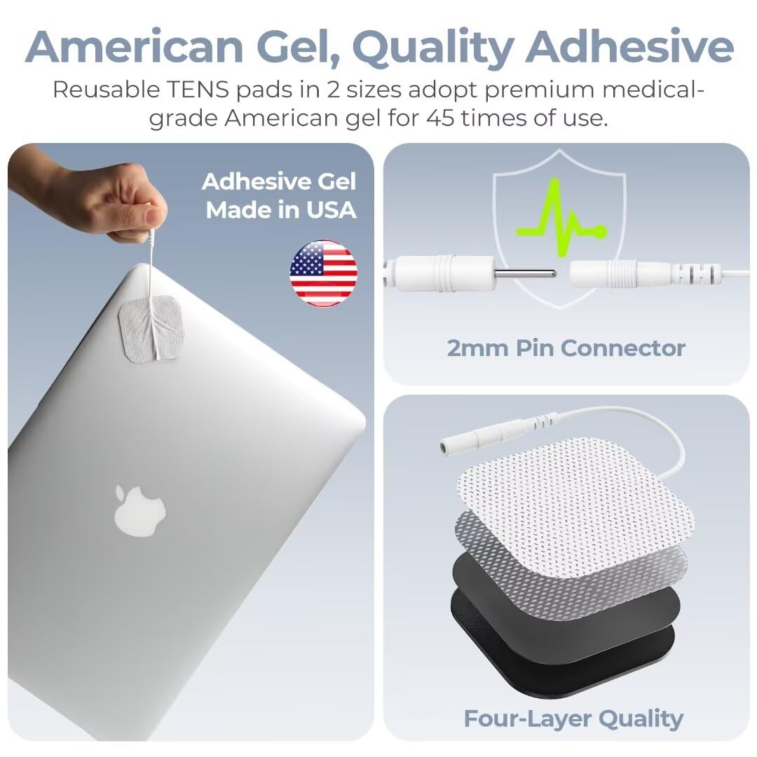 • 4 Outputs with 8 TENS Pads: If you want efficient pain relief therapy for 4 body parts at the same time or enjoy relief with your lover, this TENS machine is the ideal choice. It features 4 outputs for multi-area treatment with up to 8 American Gel TENS pads. The electrode pads in 2 sizes can meet your specific relief needs. The 2' x 2' electrodes are ideal for shoulders or necks, and the larger 2' x 4' pads are suitable for large body areas like the back