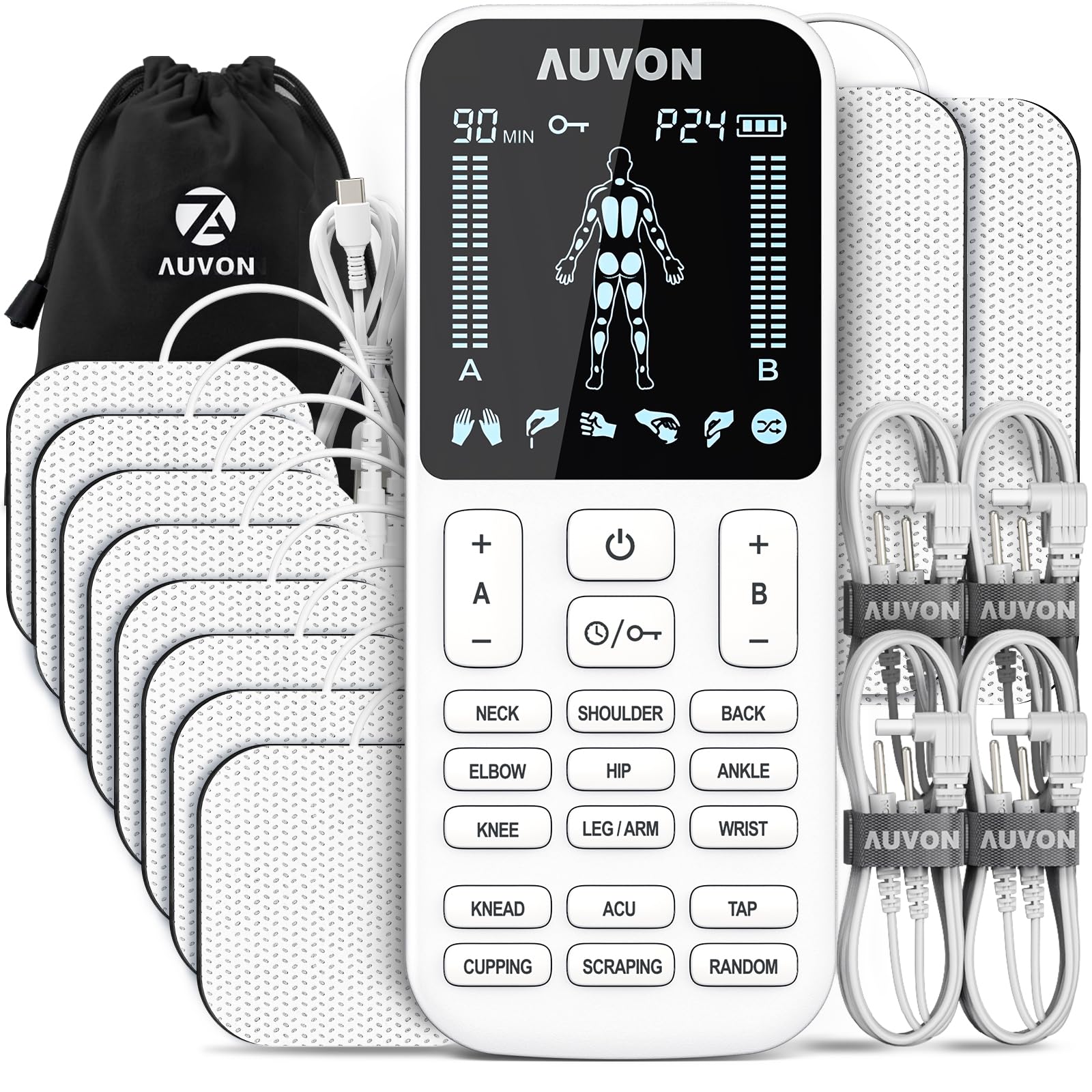 AUVON 4 Outputs TENS Unit Muscle Stimulator with 24 Modes & Intuitive Operation Design, FSA & HSA Eligible, TENS Machine with 10 TENS Pads, Electronic Pulse Massager for Back Pain Relief Therapy