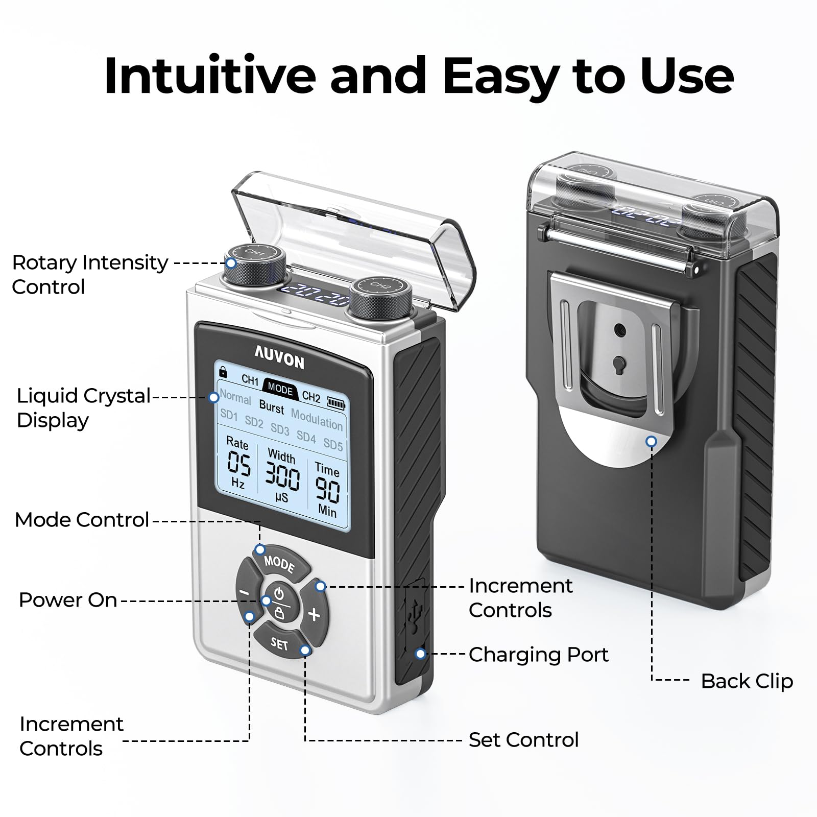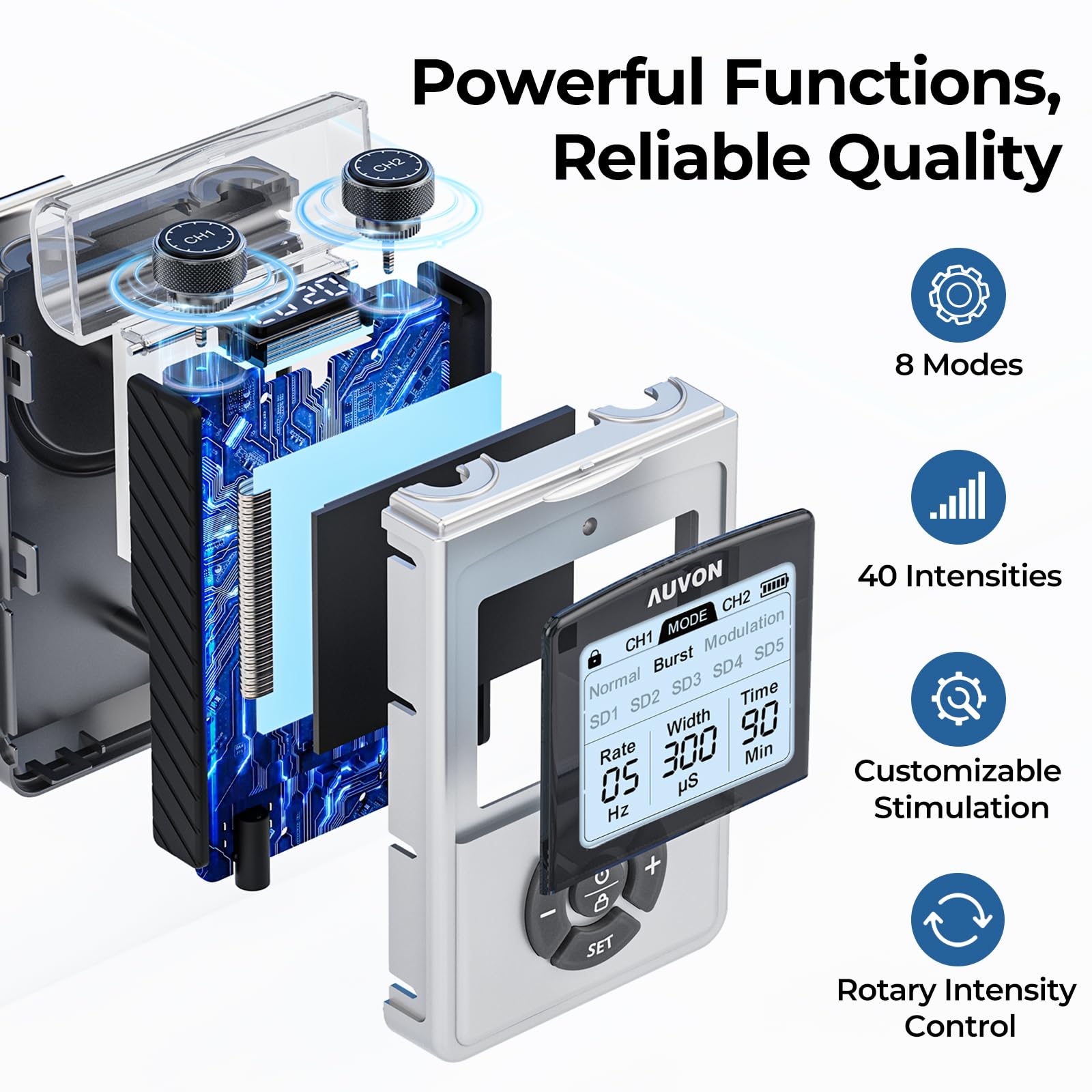 • 8 Customizable Modes: AUVON PT1 Pro TENS unit features 8 modes with adjustable settings, which allows you to choose the frequency and pulse width freely according to your physical therapist's advice and your body condition. This back pain relief device is designed with 40 levels, offering you more options for relief therapy without shock feelings. You can also operate it with different level settings through the A/B channel