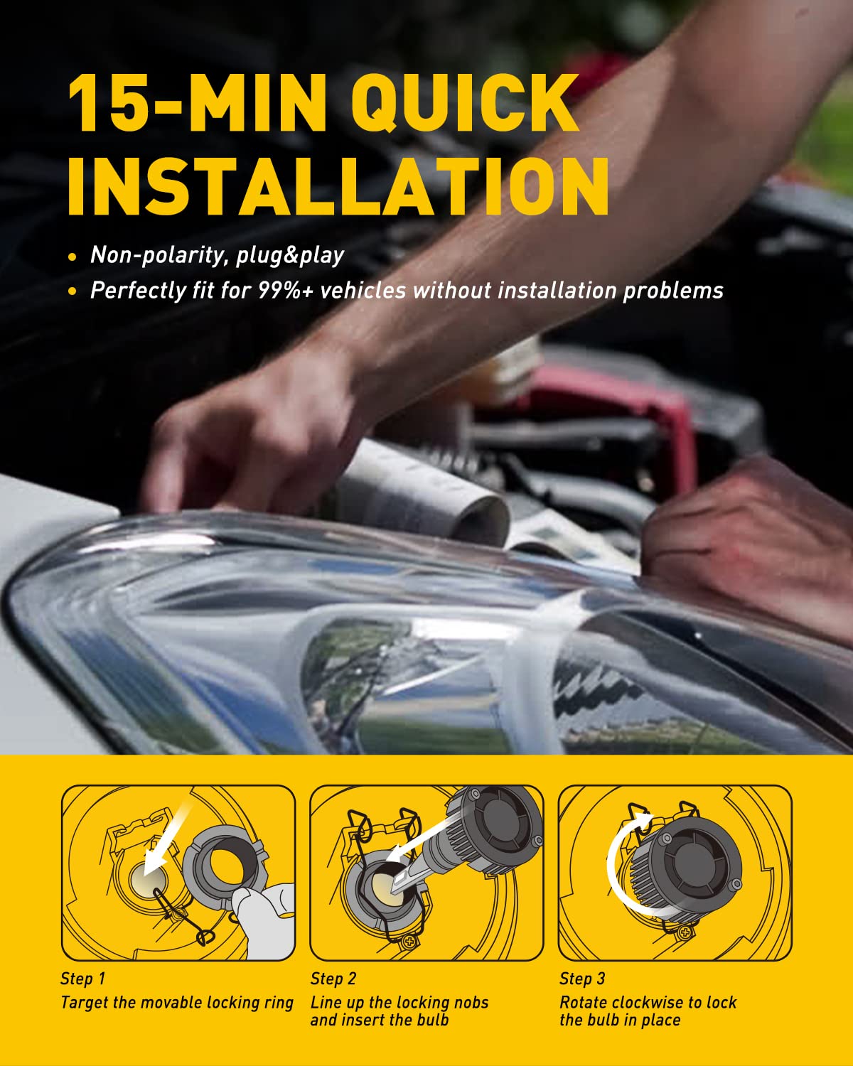 • Long-lasting Performance: Constructed with an aviation-grade aluminum body and an intelligent temperature control system, these bulbs offer superior cooling capabilities. They can operate in temperatures ranging from -40°F to +176°F, ensuring consistent brightness without fading. The IP67 waterproof rating makes them suitable for all weather conditions, including rain and snow