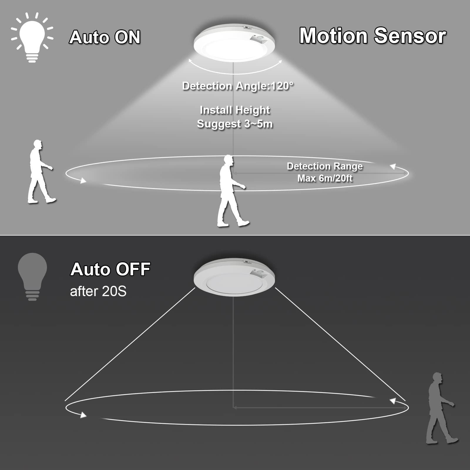 • PIR Motion Sensor & Light Sensor: Auto-on within 20 feet, auto-off after 20seconds of no motion activated, the motion sensor shed lights will turn on only when it is dark and when motion is detected. Of course, you can also through the ''On /OFF'' switch to turn on /off the lights at anytime ( Non-motion detected mode ).