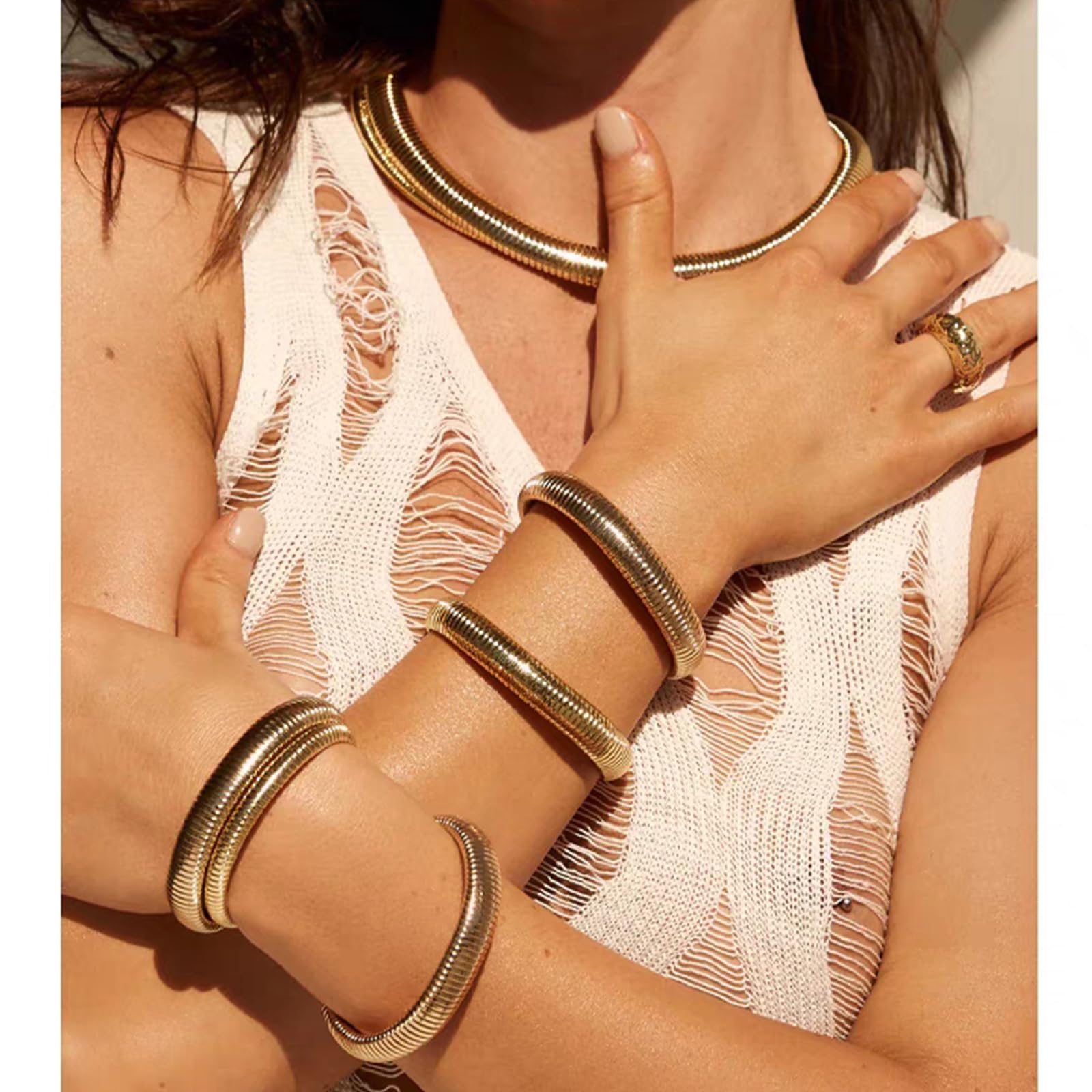 • 【Perfect Gold Bracelet Set】The design of these gold bracelet stack are simple yet bold enough to be perfect for everyday wear. Highly polished, it sparkles at every angle. Elegant and generous, these gold bracelets for women can be worn alone or stacked to match different outfits and moods.