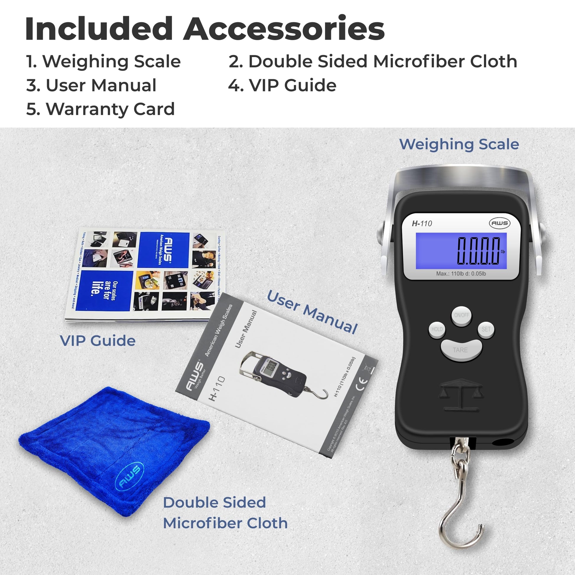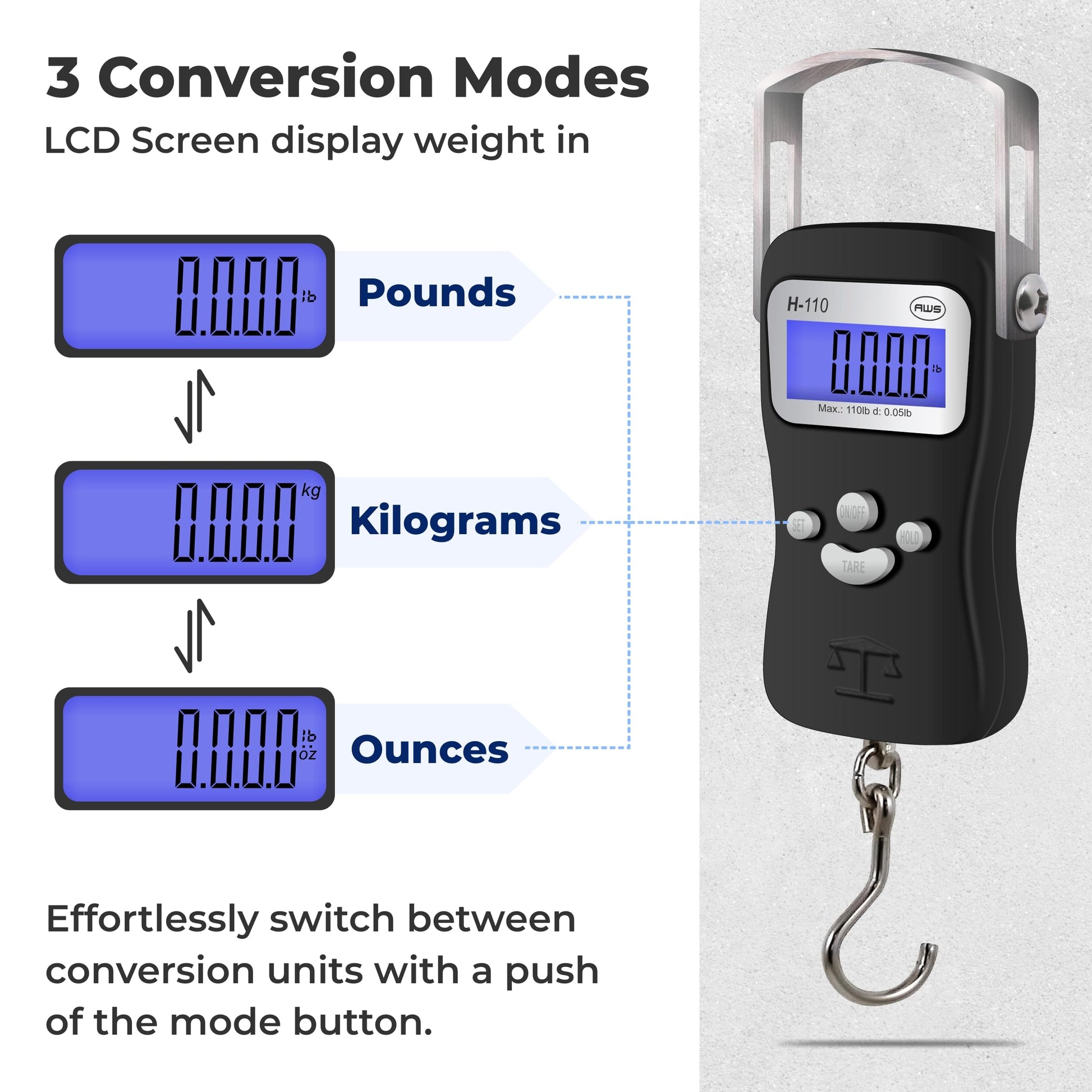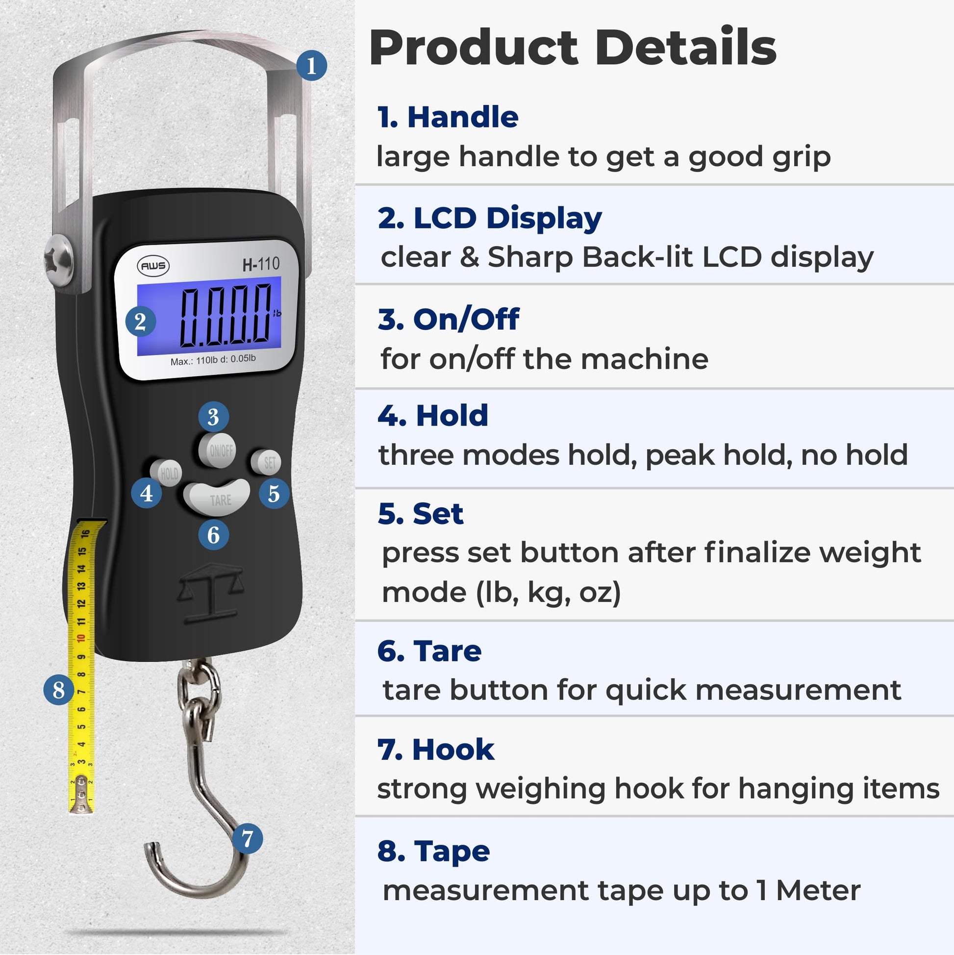 • Multi-Purpose Hanging Scale – 110 lbs Capacity: Perfect for fishing, hunting, camping, archery, and travel, the H-110 digital hanging scale weighs up to 110 lbs (50 kg) with 0.05 lb precision. Ideal for luggage, game, gear, and more.